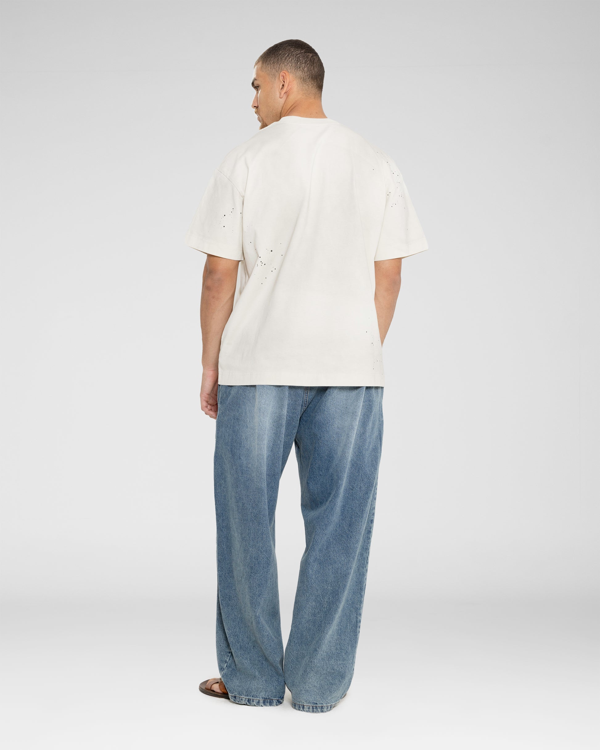 Light-wash, wide-leg denim pants with an elasticated drawstring waist and bead-tipped cords, blending laid-back comfort with casual style.