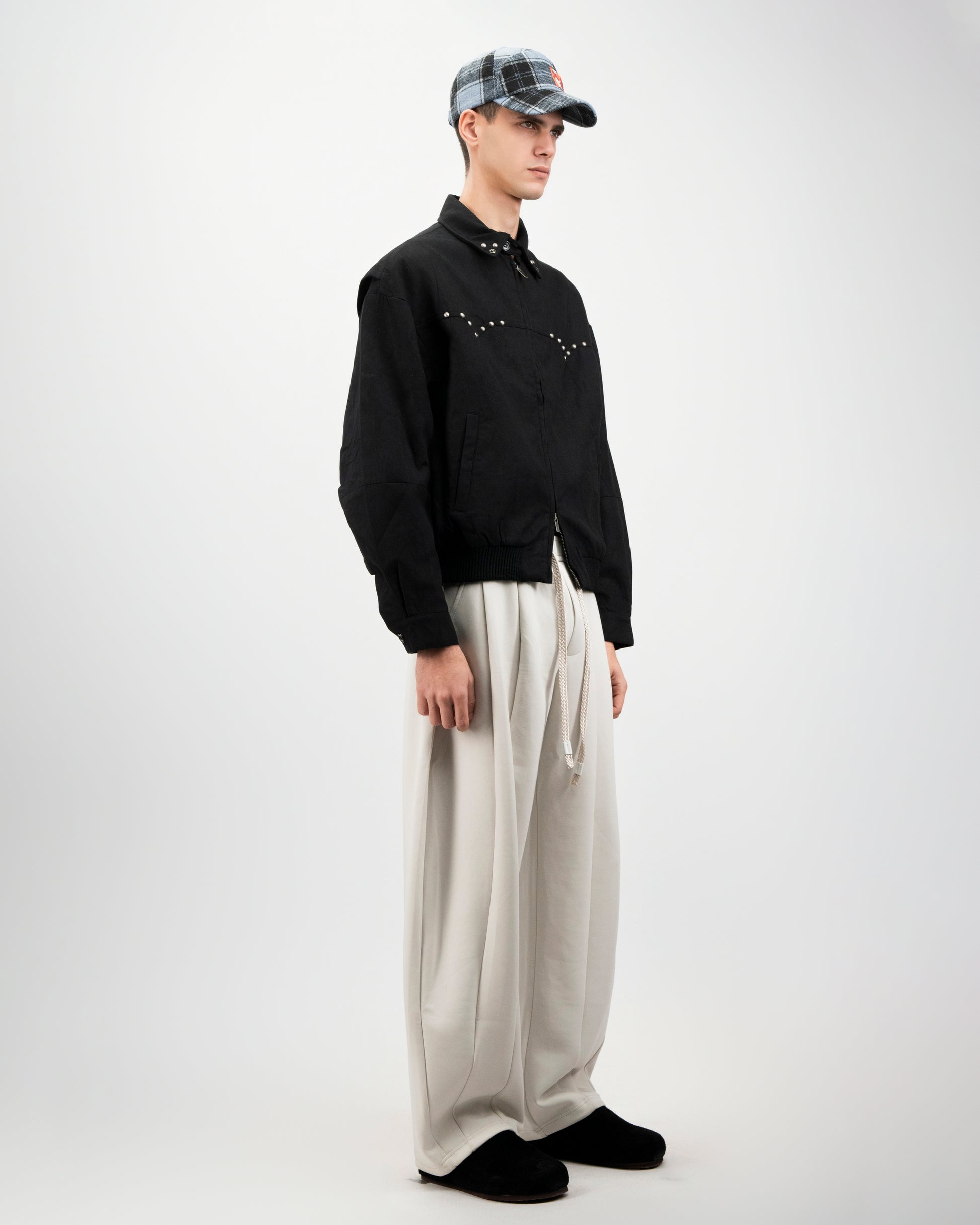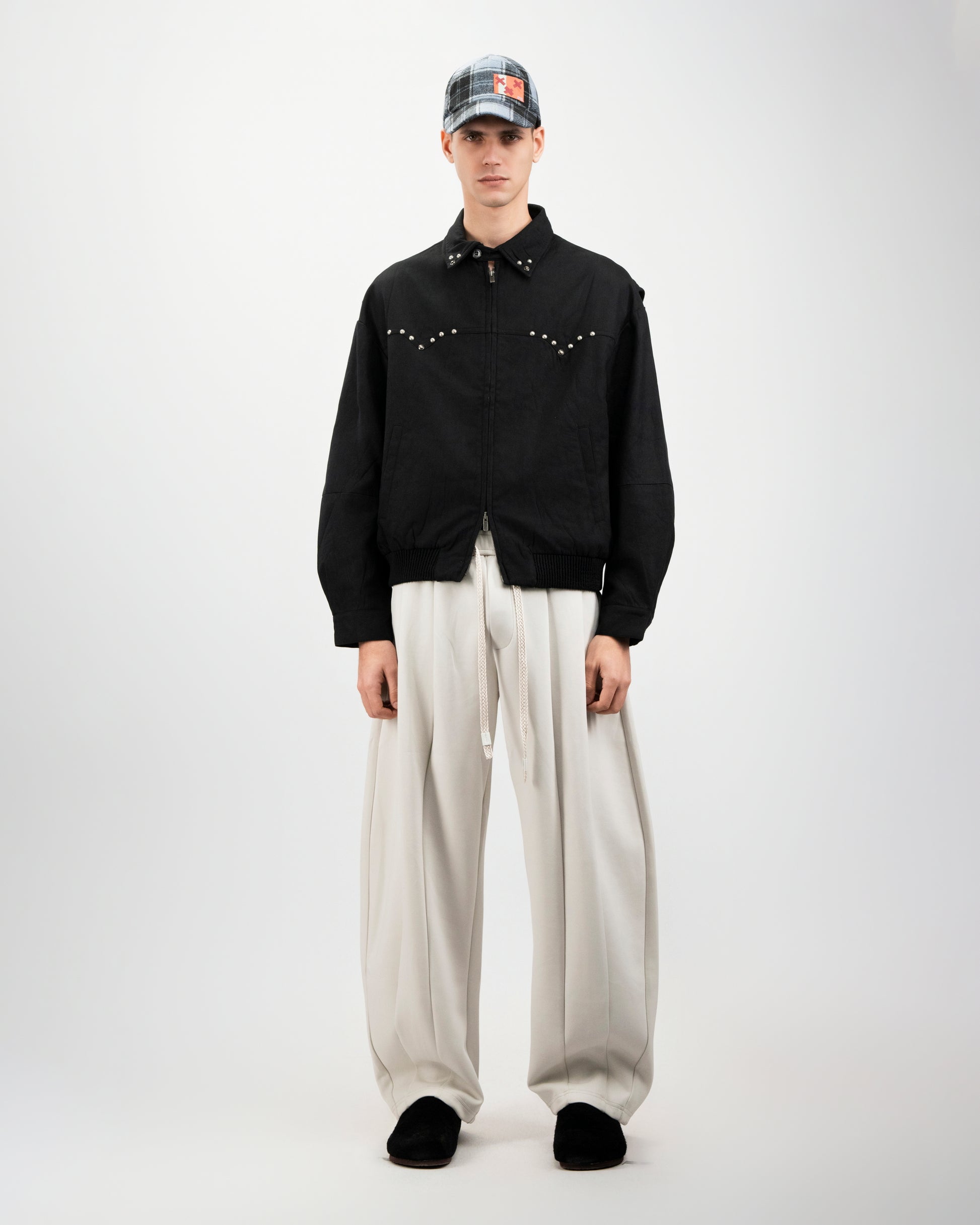 The Studline Jacket brings subtle attitude to a classic silhouette. Designed with a relaxed fit and clean button-front construction, it features minimal metal stud detailing across the chest for a quiet statement finish. Cut in black with soft structure, it balances edge and restraint,an elevated everyday jacket that works layered or worn on its own.