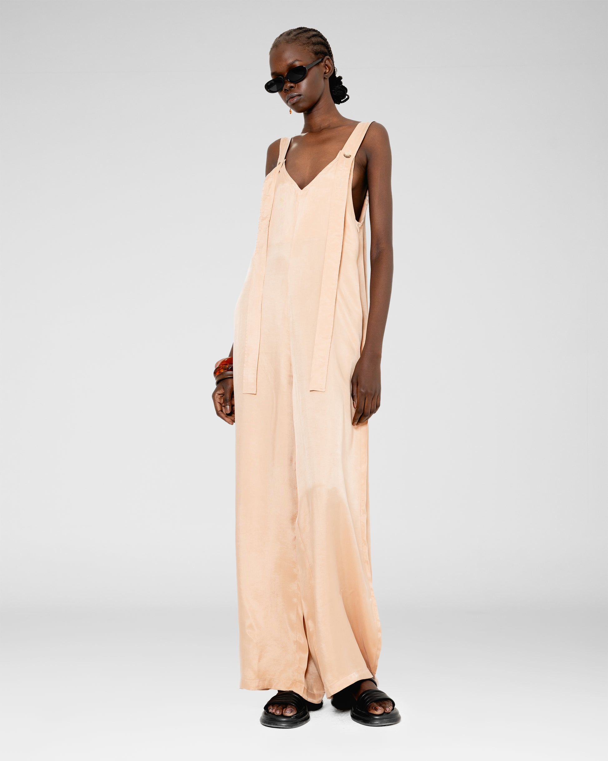 Flowing wide-leg overall with a deep V-neckline, adjustable shoulder straps, and an airy, liquid-like sheen for effortless elegance.
