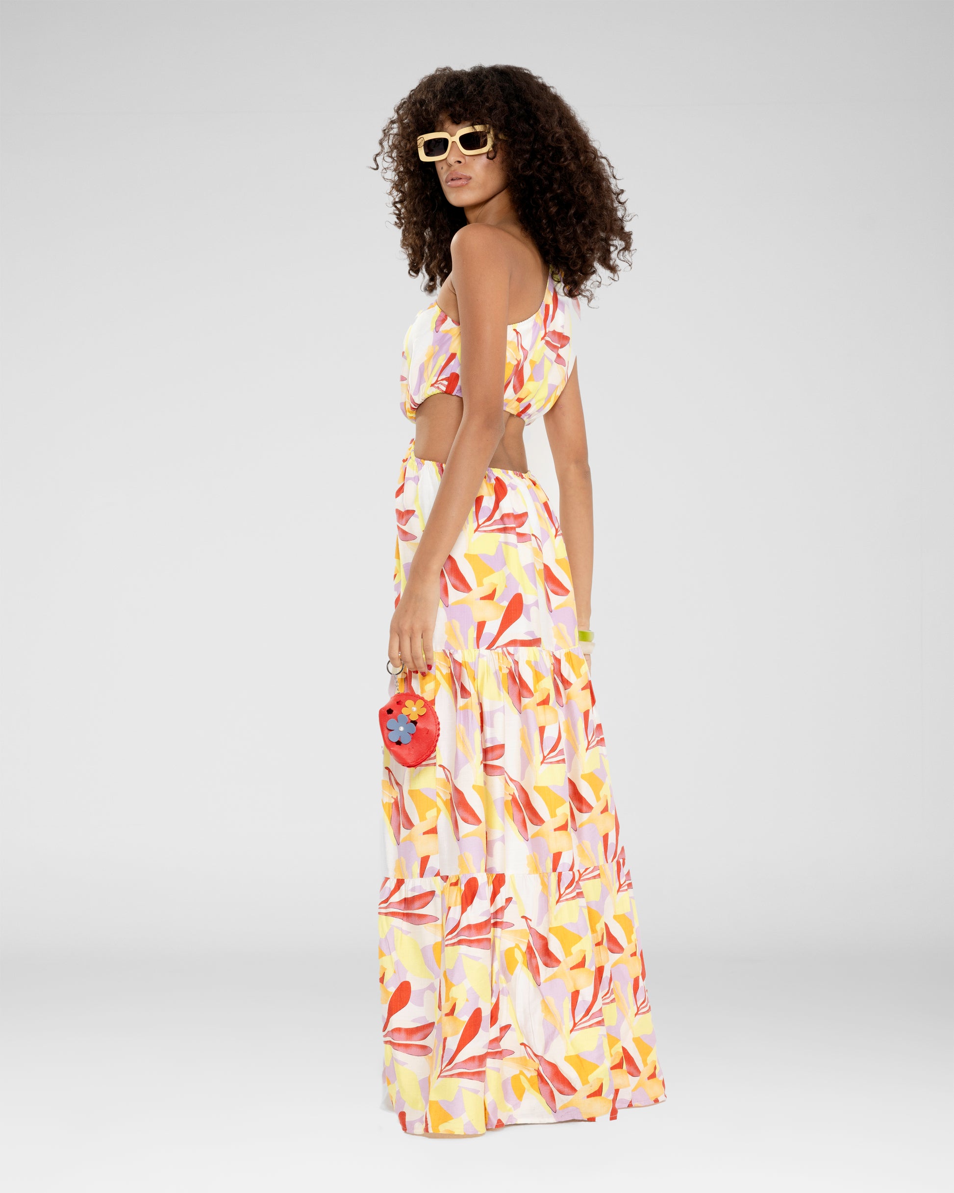 One-shoulder maxi dress with a gathered ring cutout and multicolored tropical leaf print.