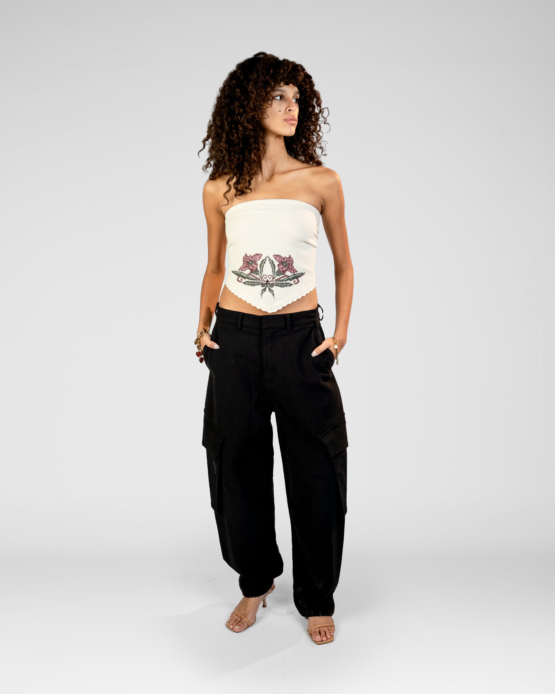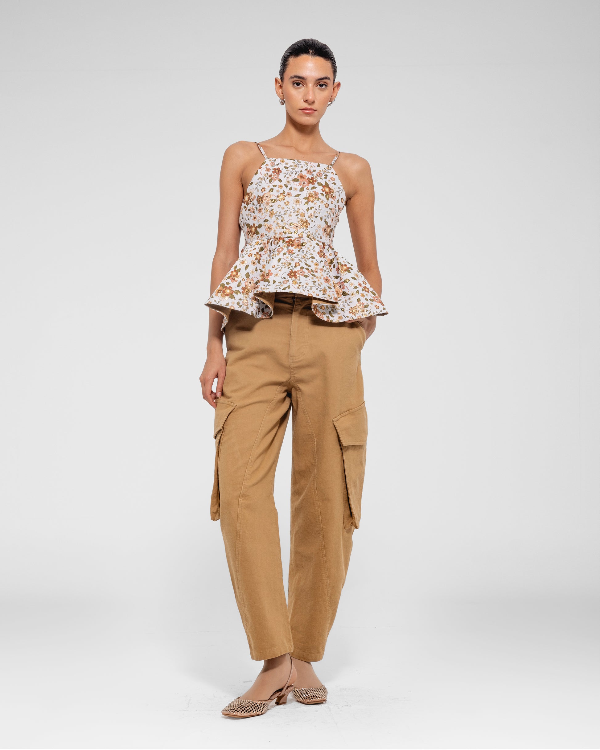 Straight-leg cargo pants with oversized side flap pockets and a relaxed mid-rise fit.