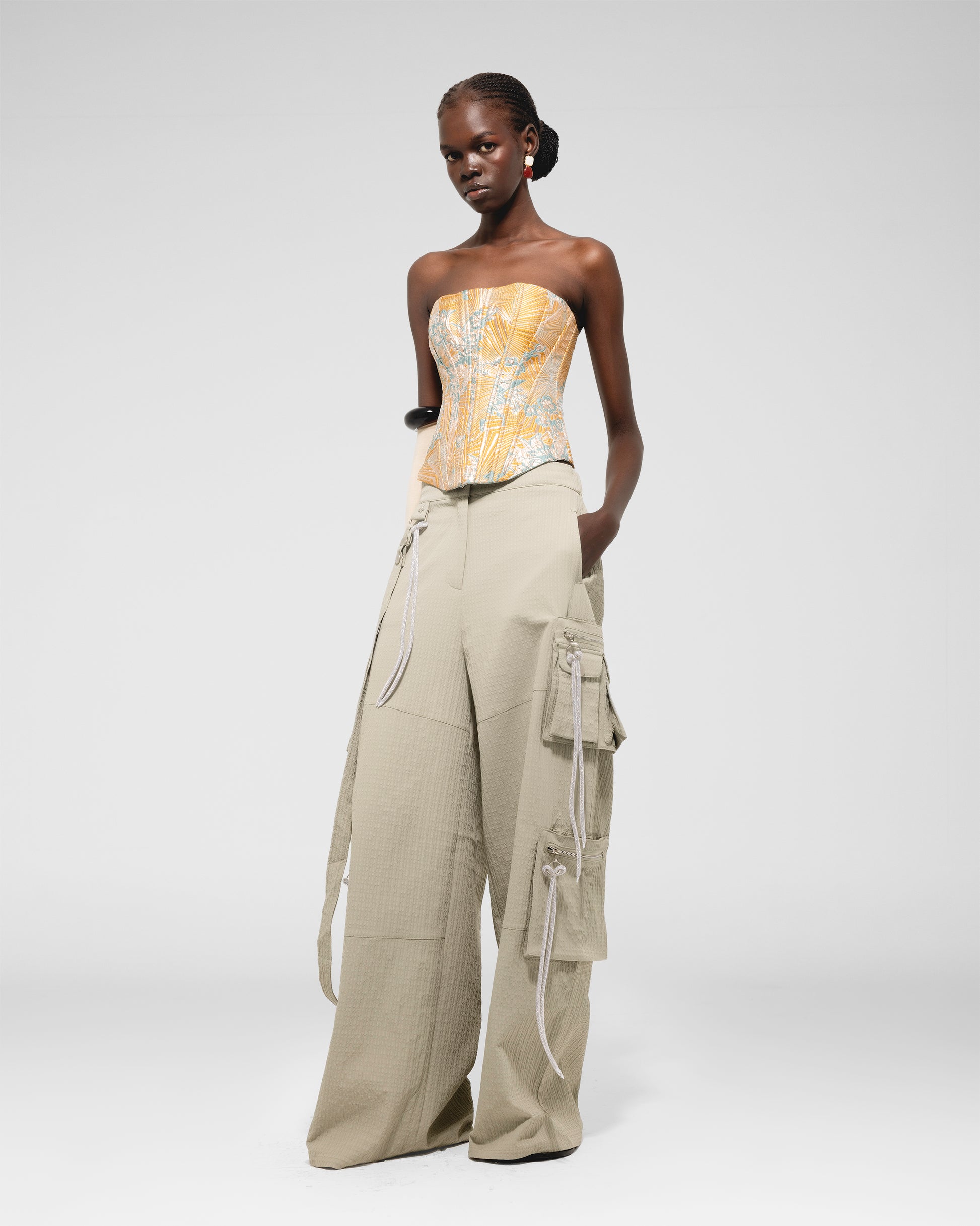 Wide-leg cargo pants with oversized flap pockets and bedazzled drawstring details.