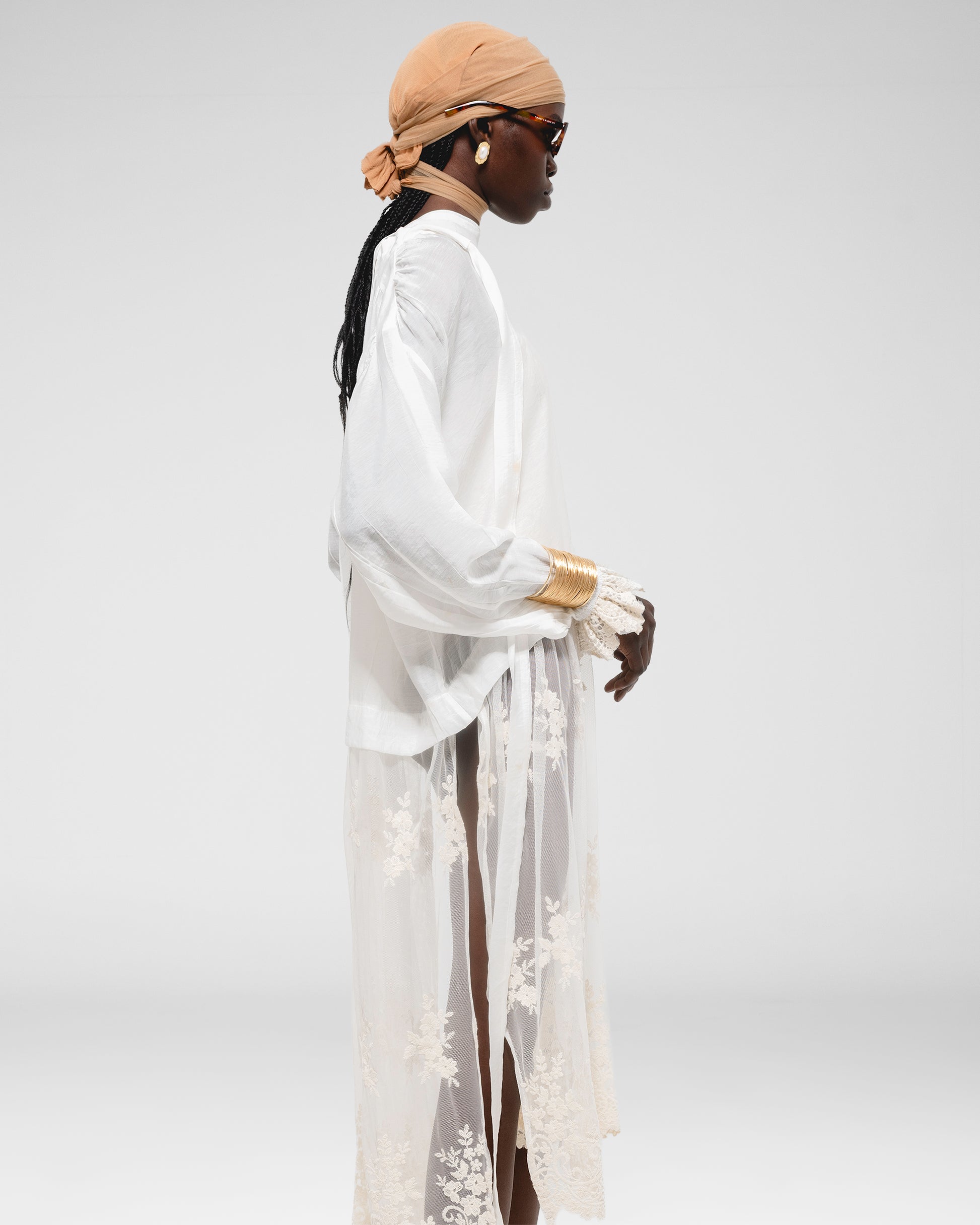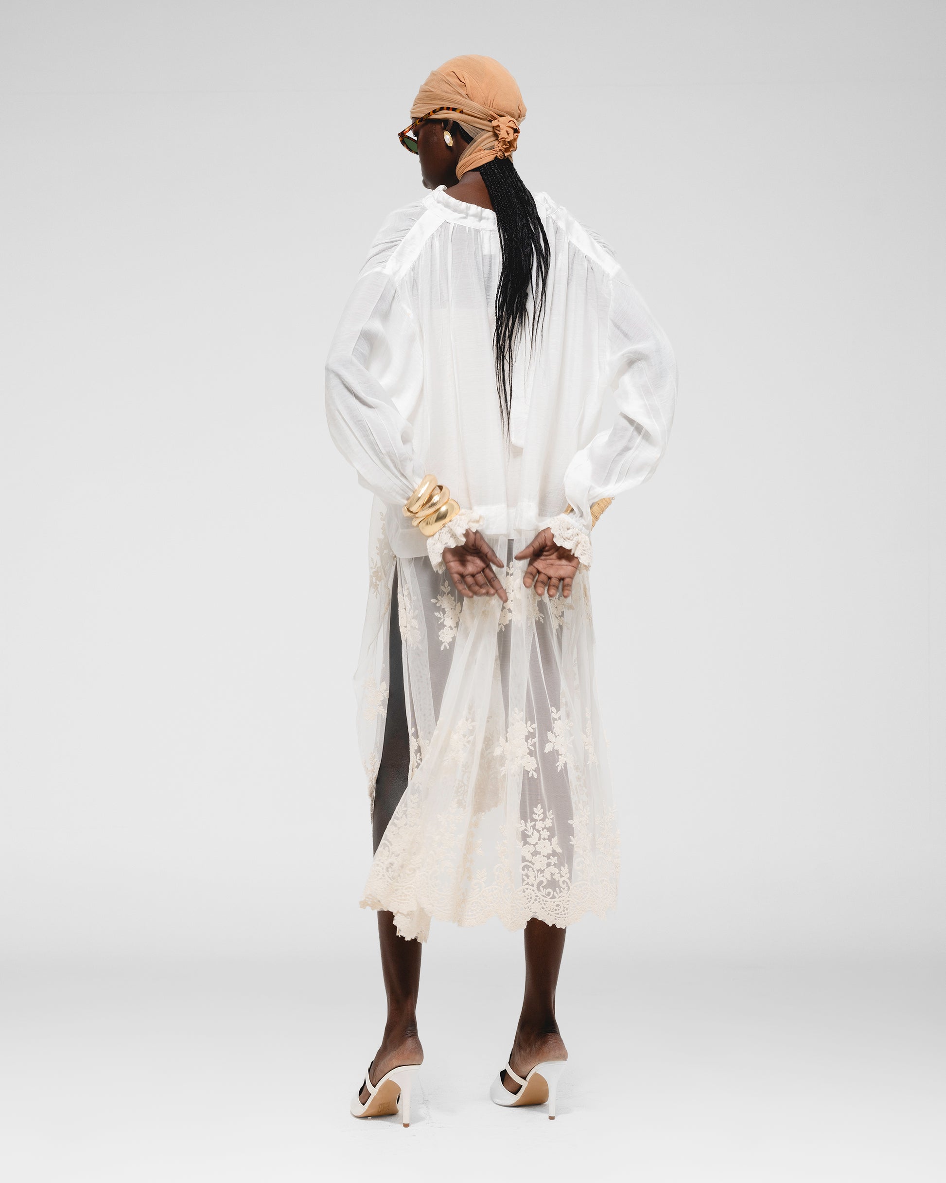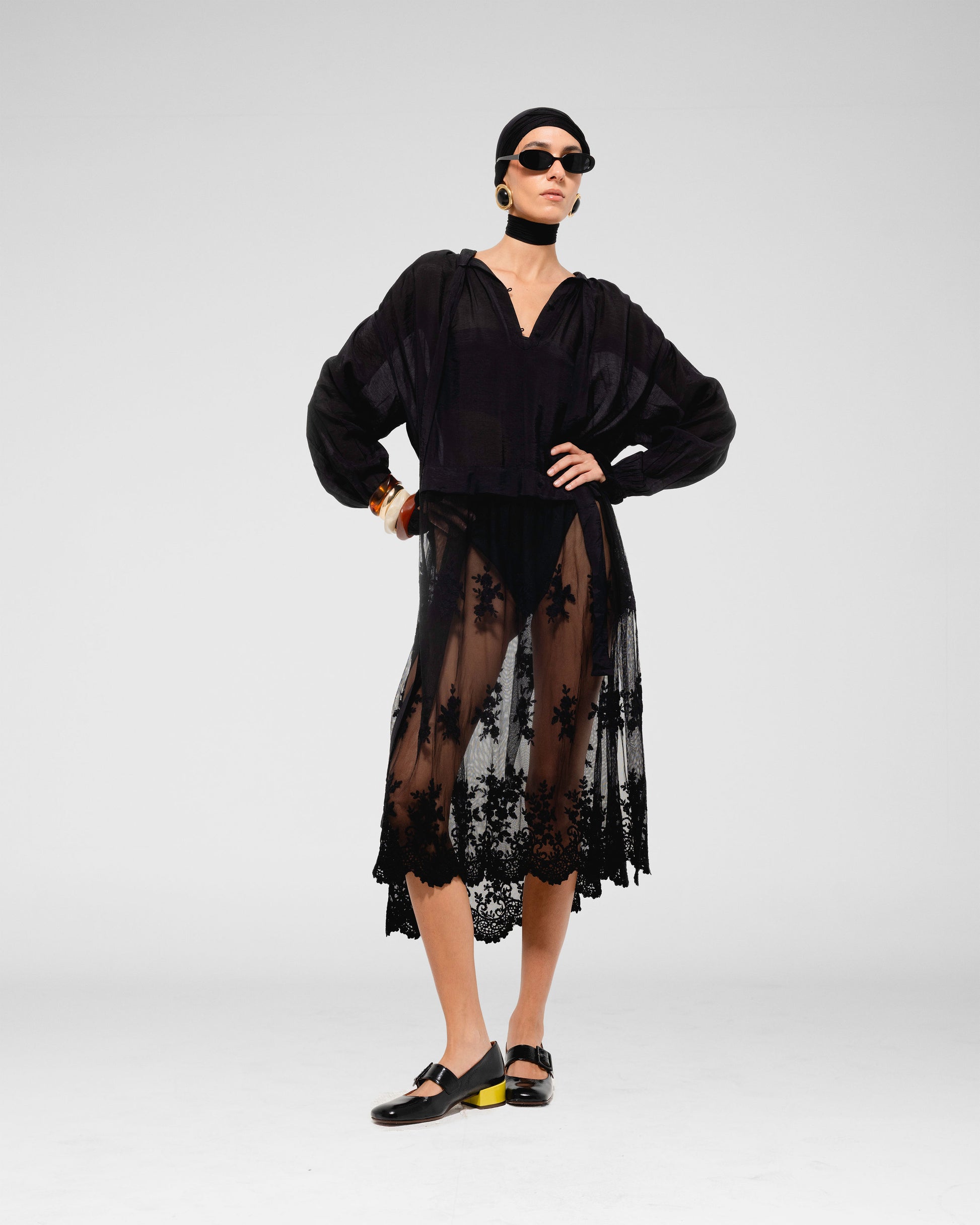 Relaxed-fit, long-sleeve blouse with a deep V-neckline and delicate lace trim at the hem.