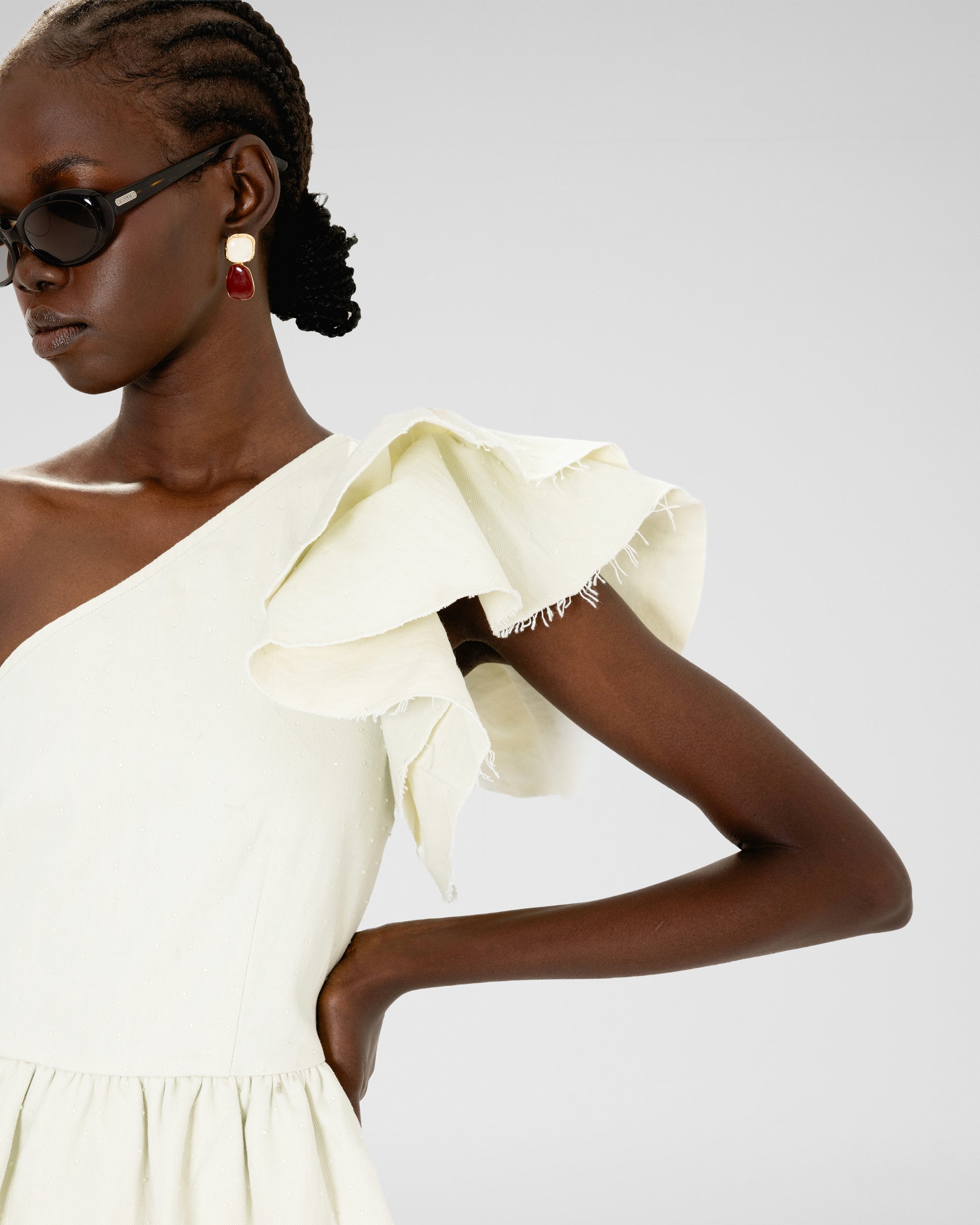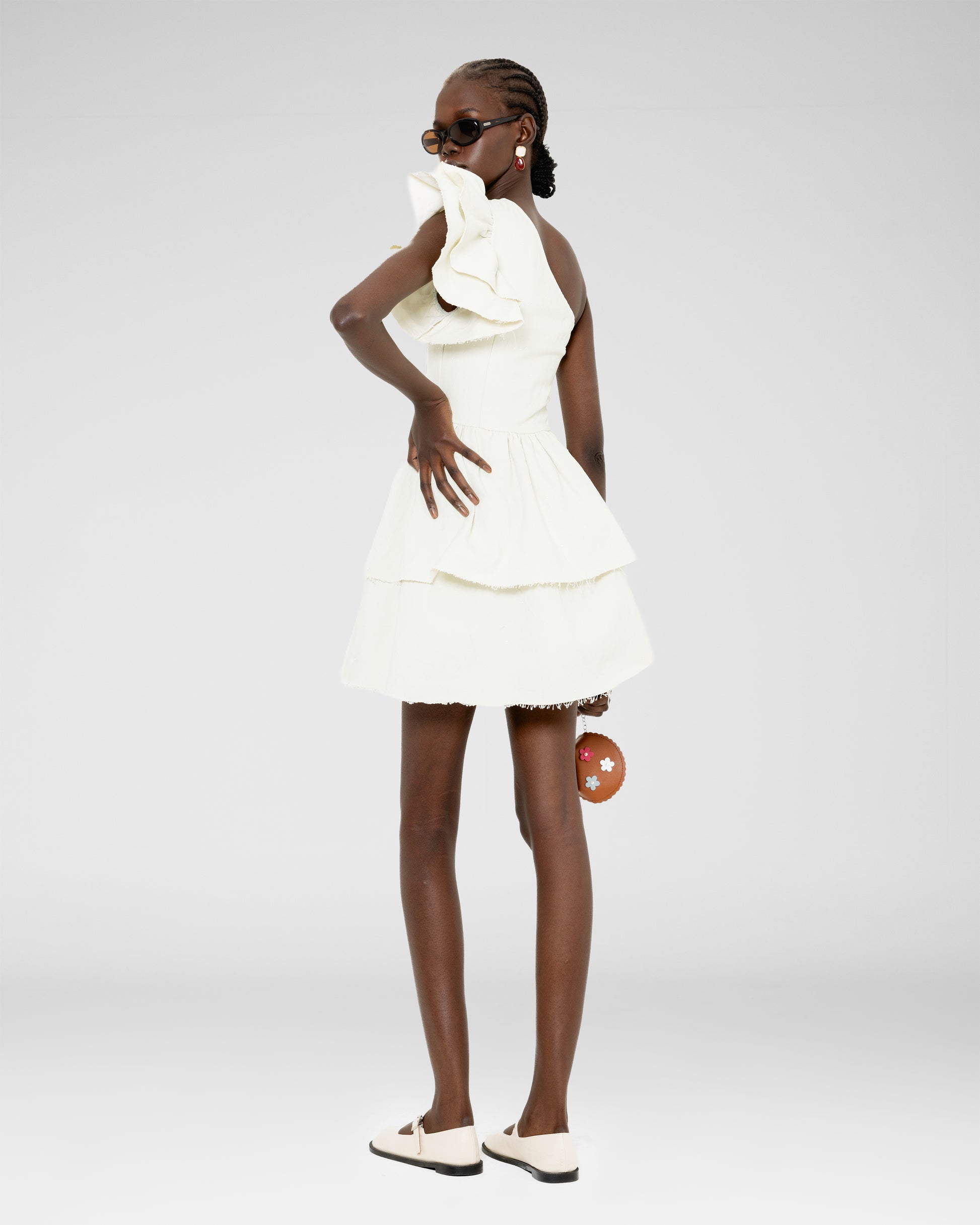 One-shoulder ivory mini dress with tiered raw-edge ruffles and sculptural shoulder detailing.