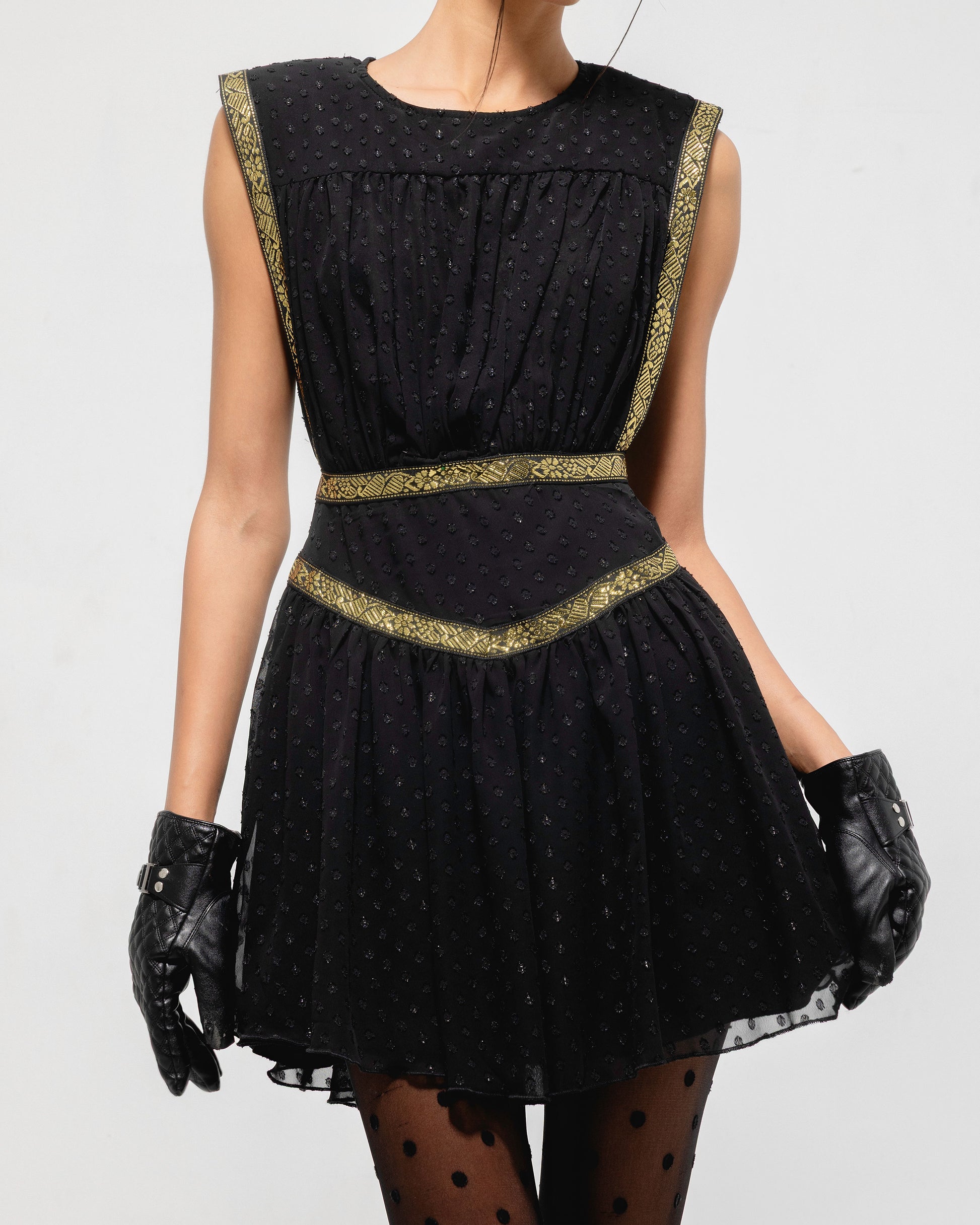 Sleeveless mini dress with delicate textured dot pattern, gold embroidered trim, and a softly flared skirt. |