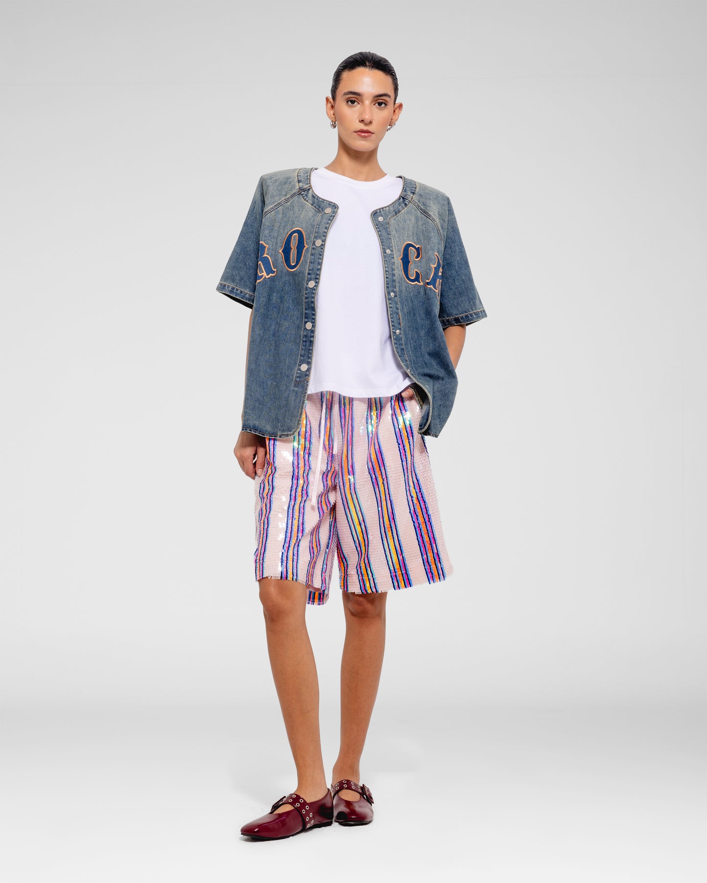 Knee-length shorts with a relaxed fit, featuring multicolored vertical sequin stripes on a textured base.