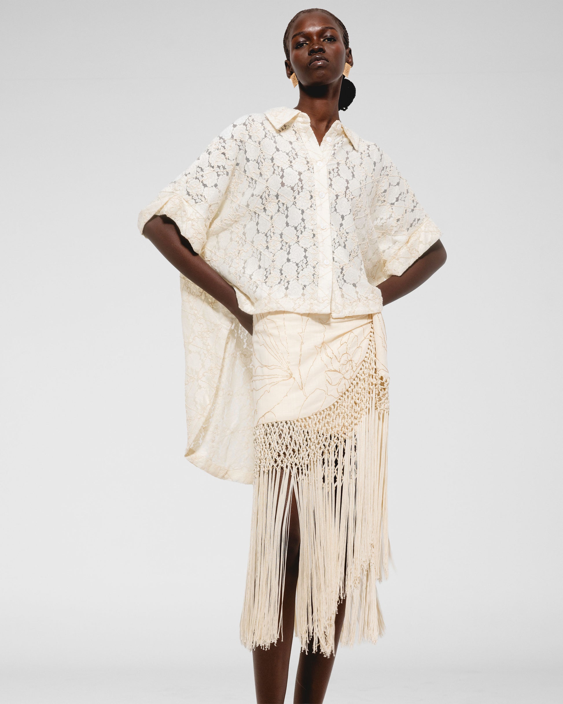 Wrap, mid-length skirt with embroidery and cascading fringe hem.
