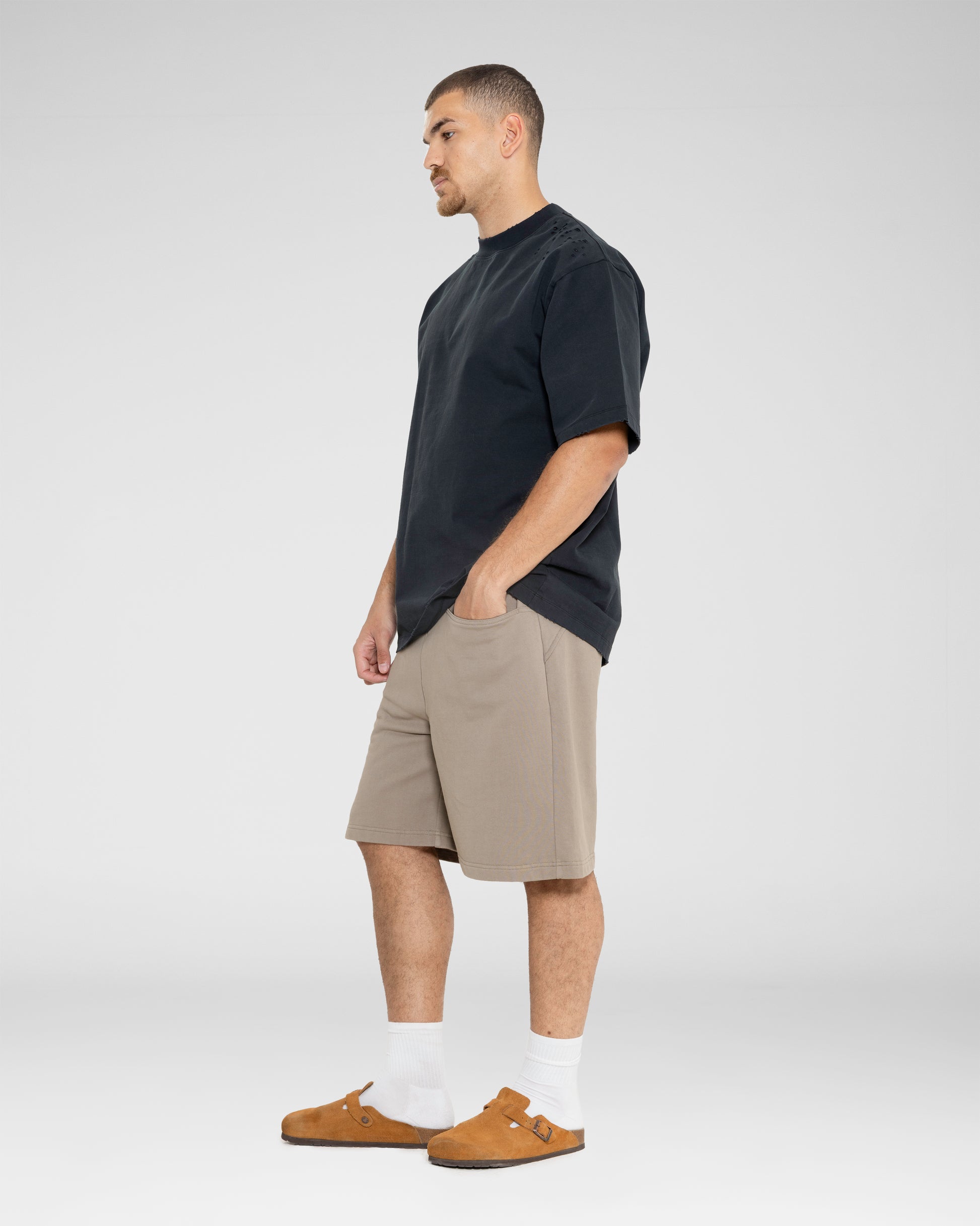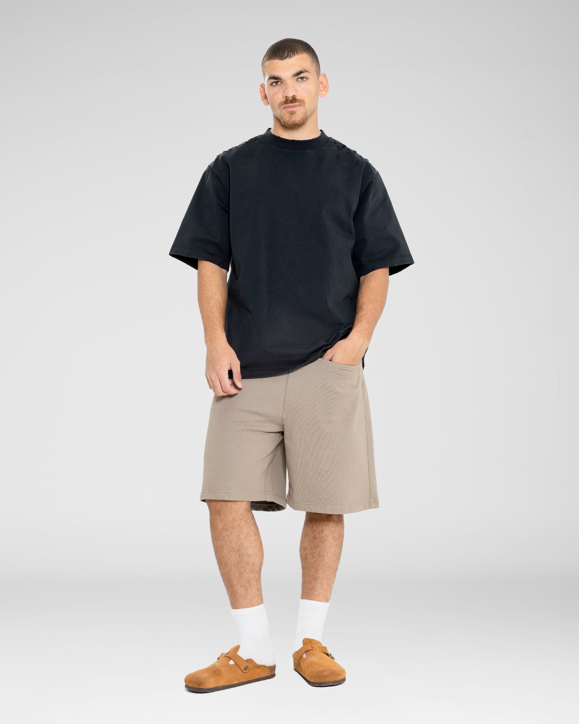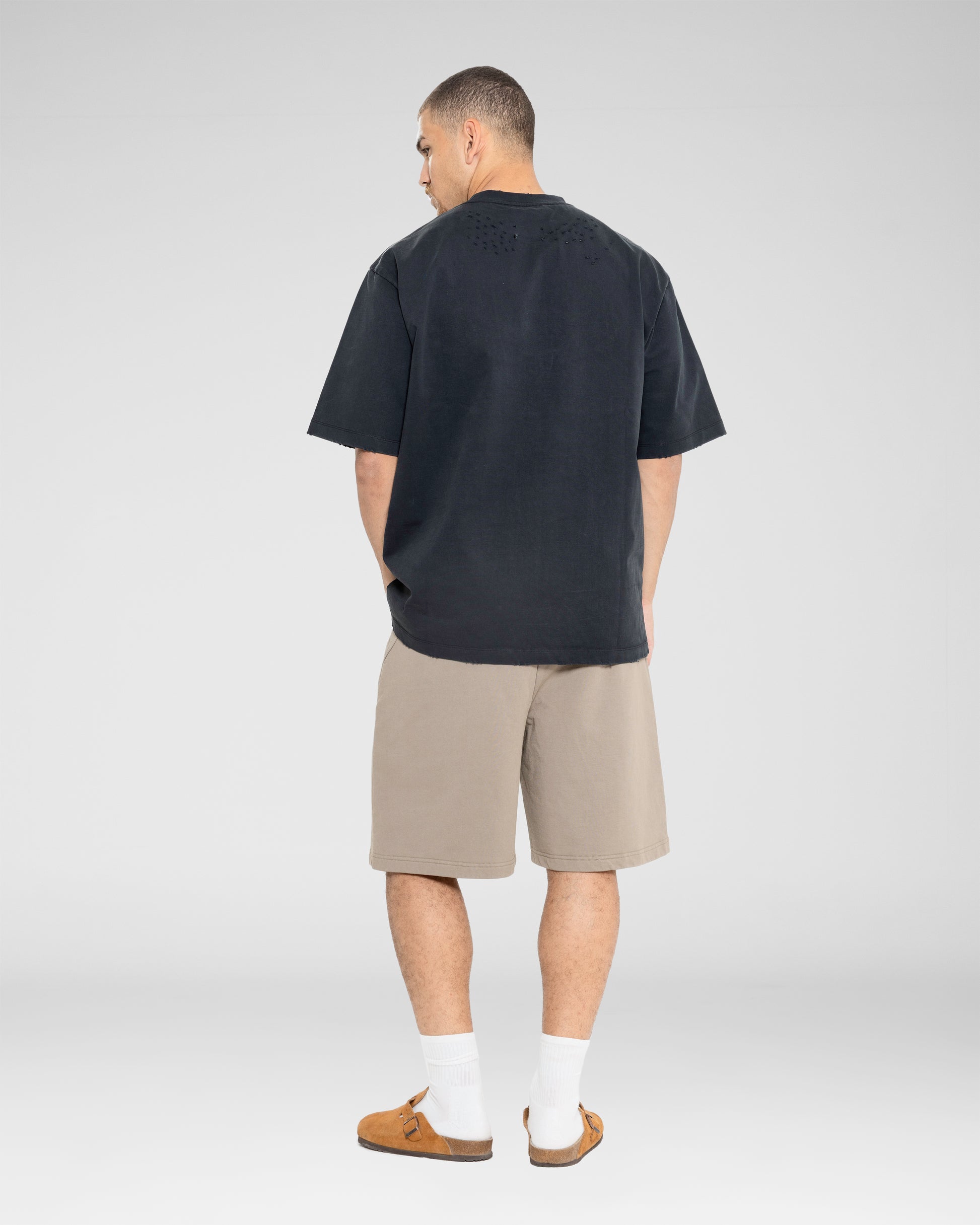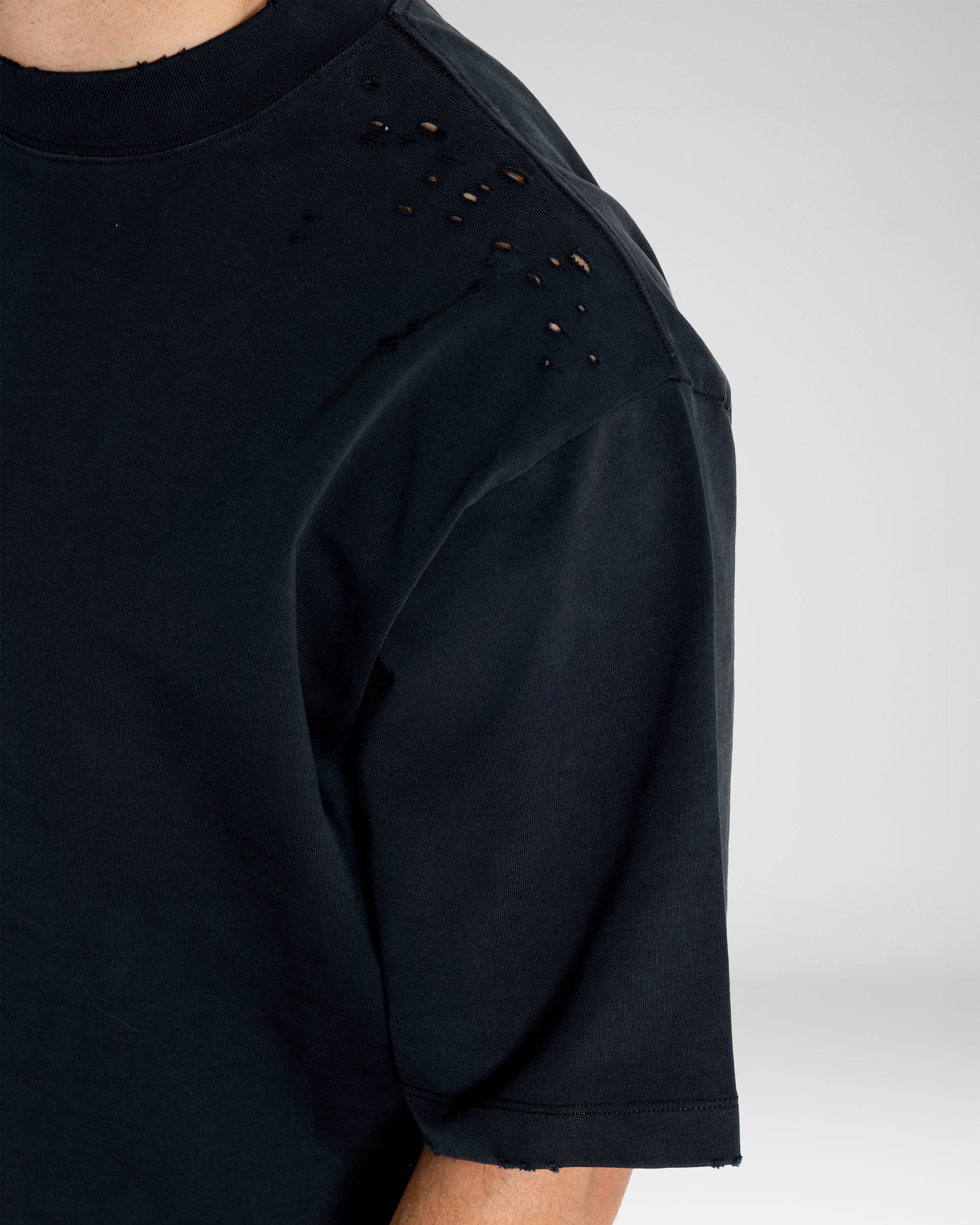 Oversized tee with subtle shoulder distressing and raw edges for a worn-in, urban edge