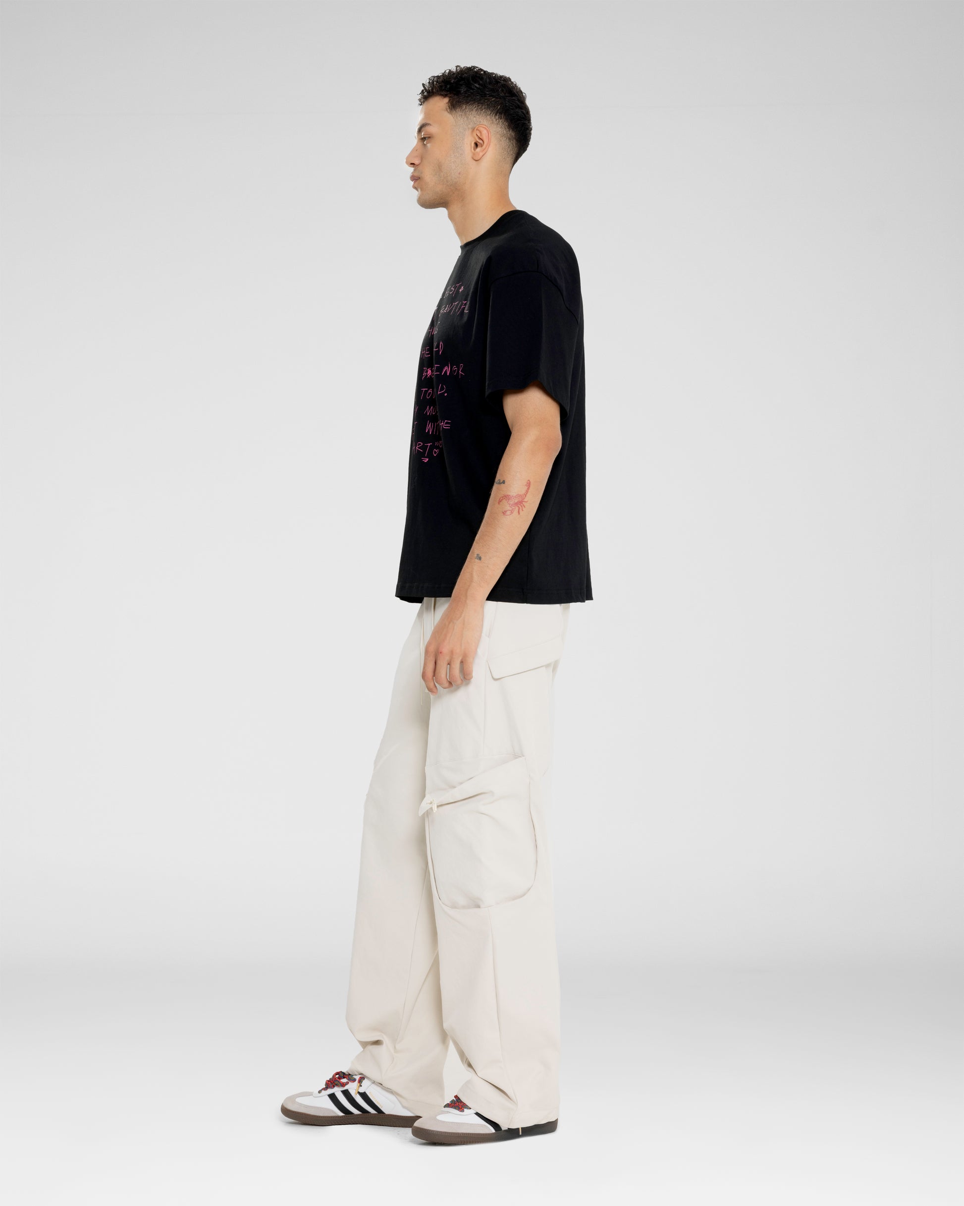Oversized crewneck T-shirt with a bold hand-drawn text graphic that celebrates beauty felt with the heart.
