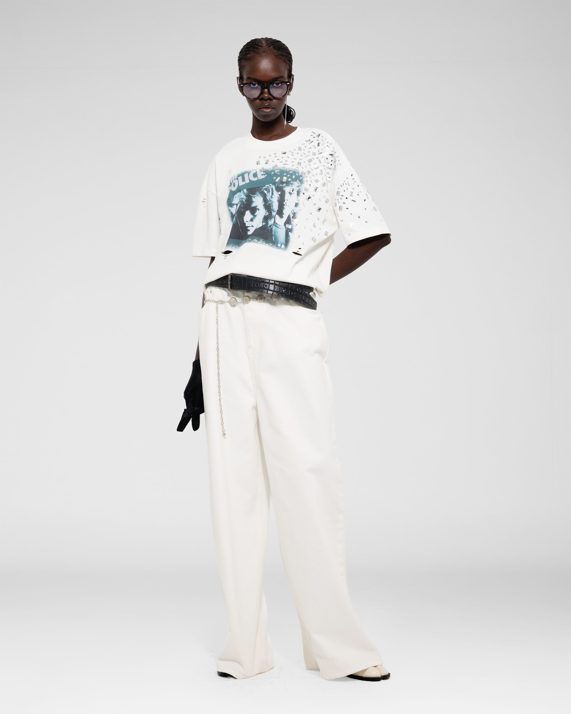 Oversized faded band tee with mirrored bead embellishments scattered across the shoulder.