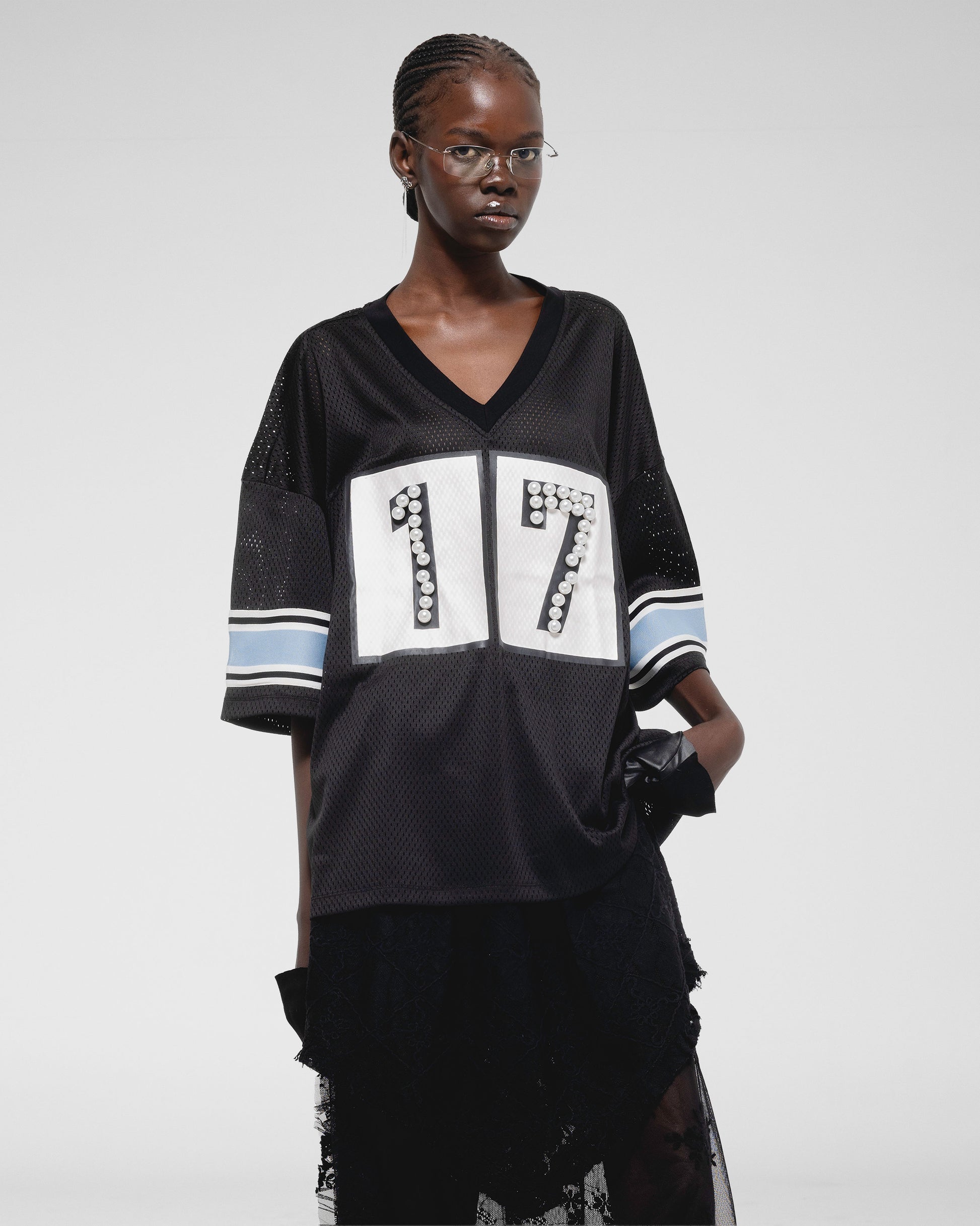 Oversized mesh jersey with bold number patch and pearls with striped sleeves.