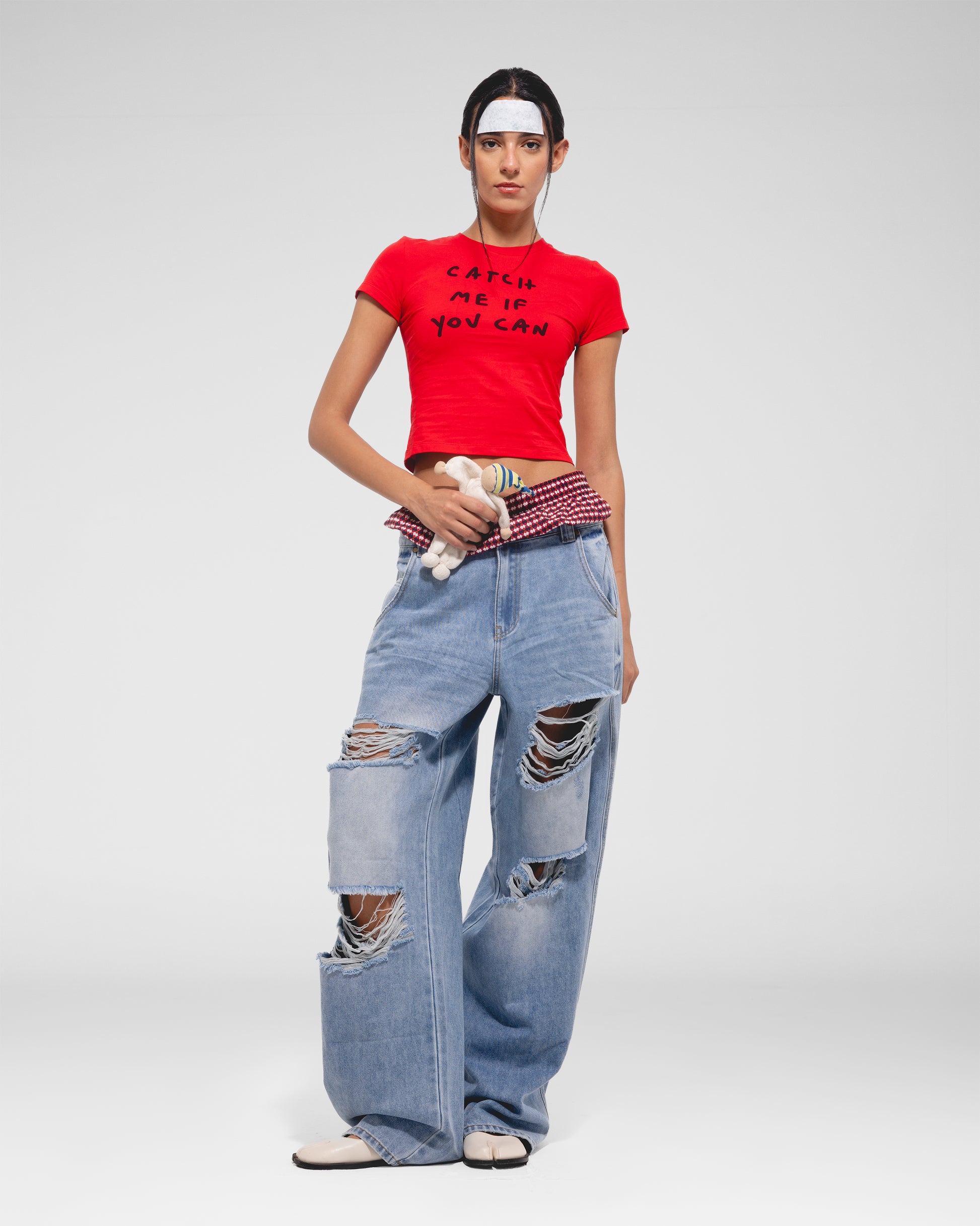 Fitted short-sleeve crop top with a crew neckline and playful “Catch Me If You Can” text across the chest.