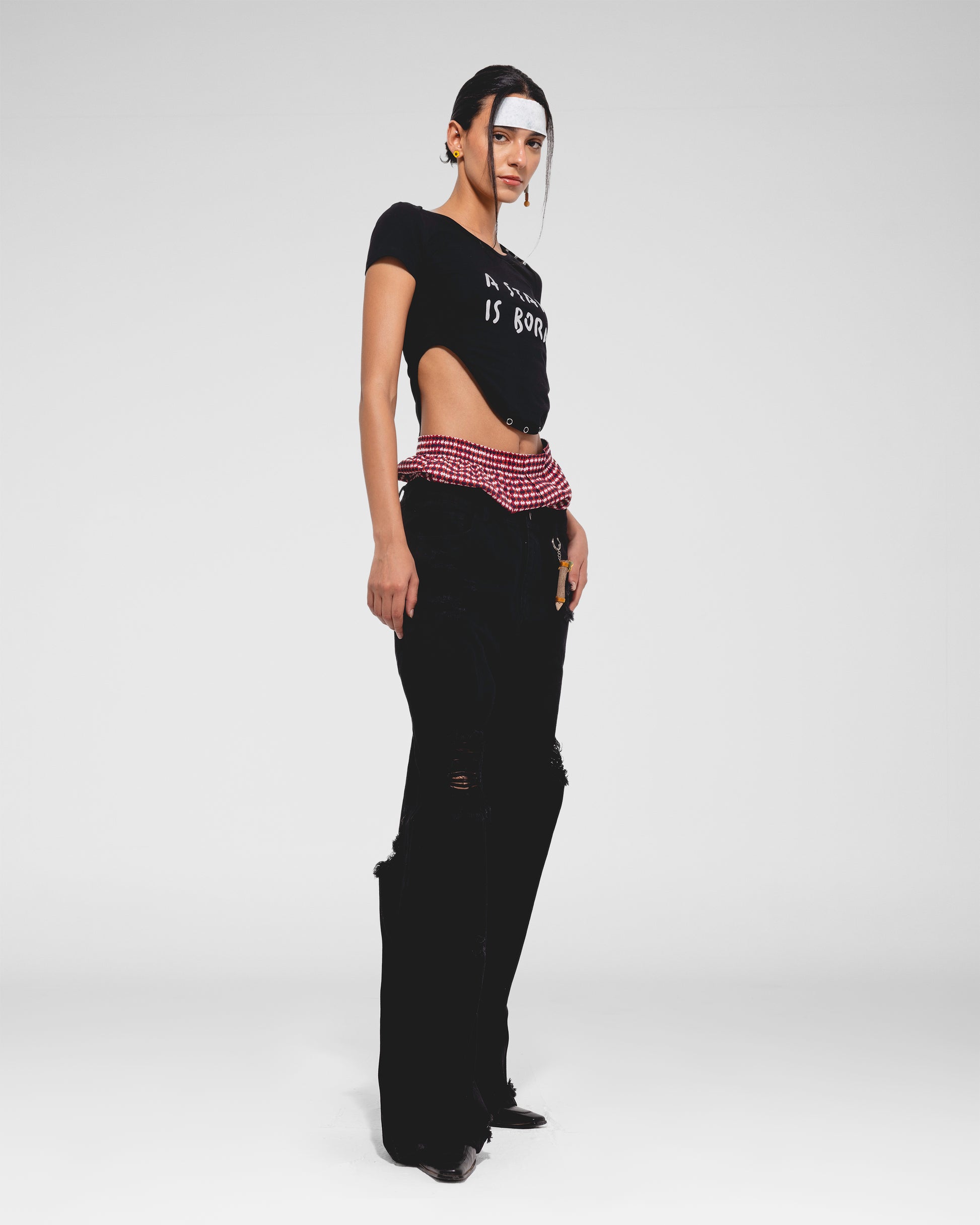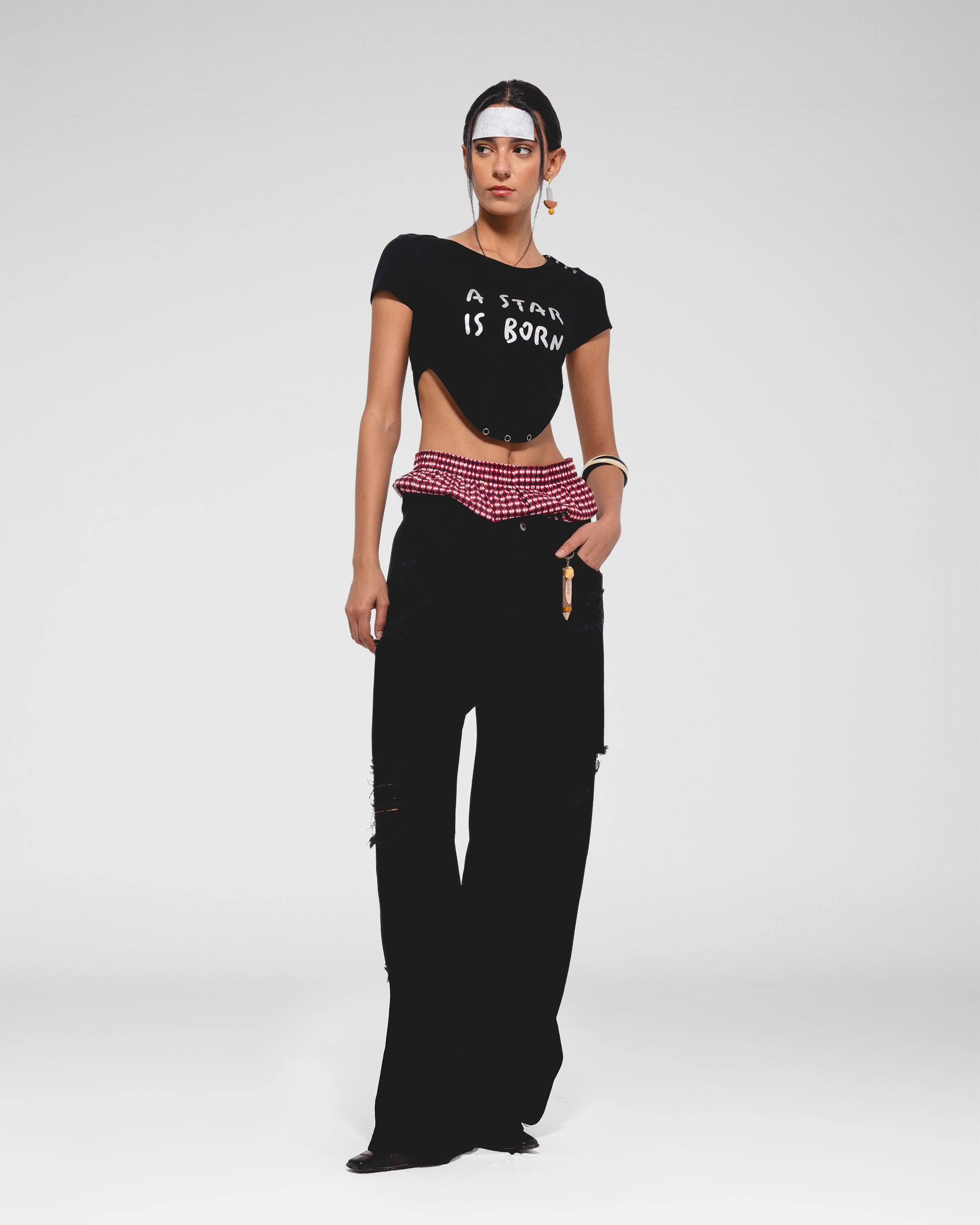 Fitted crop top with an angular asymmetric hem, metal grommet accents, and bold “A Star Is Born.