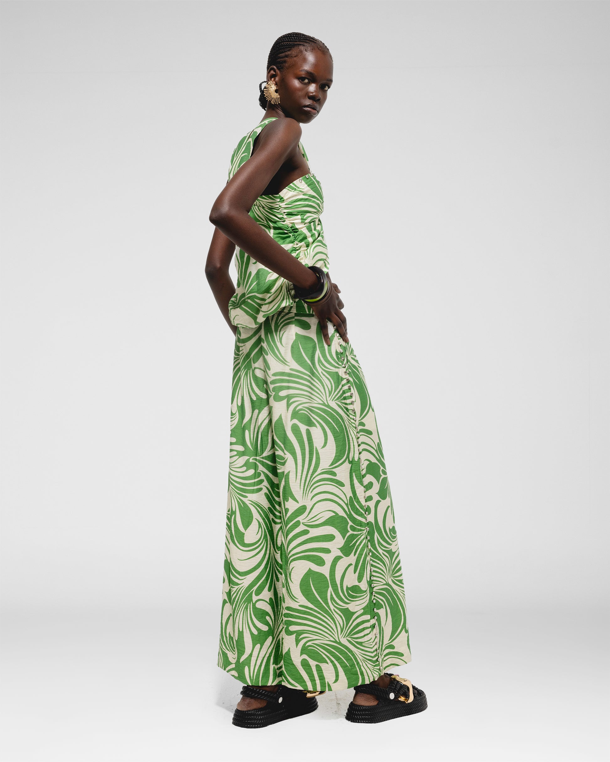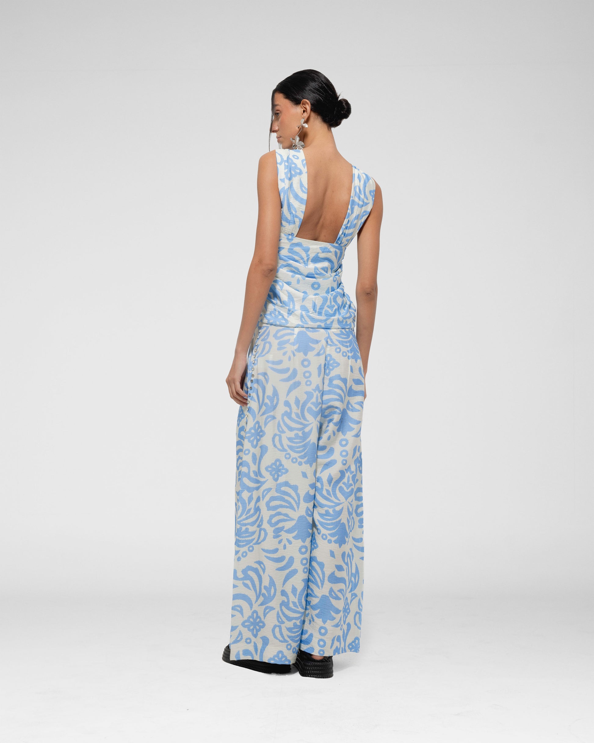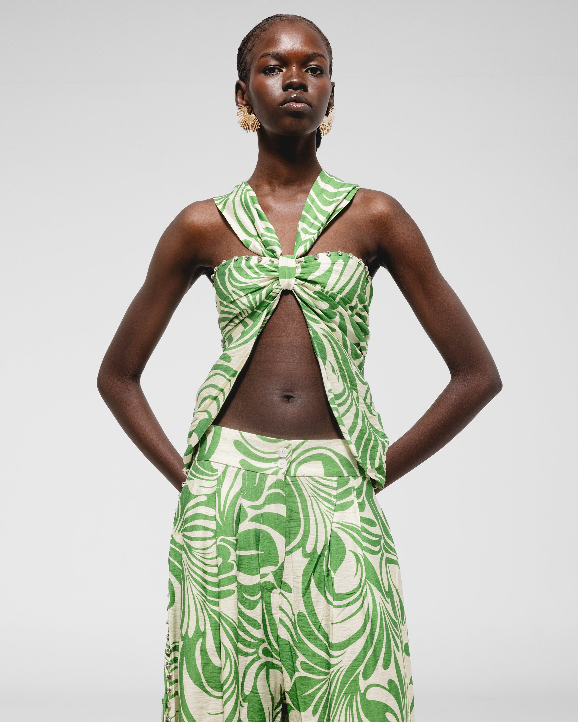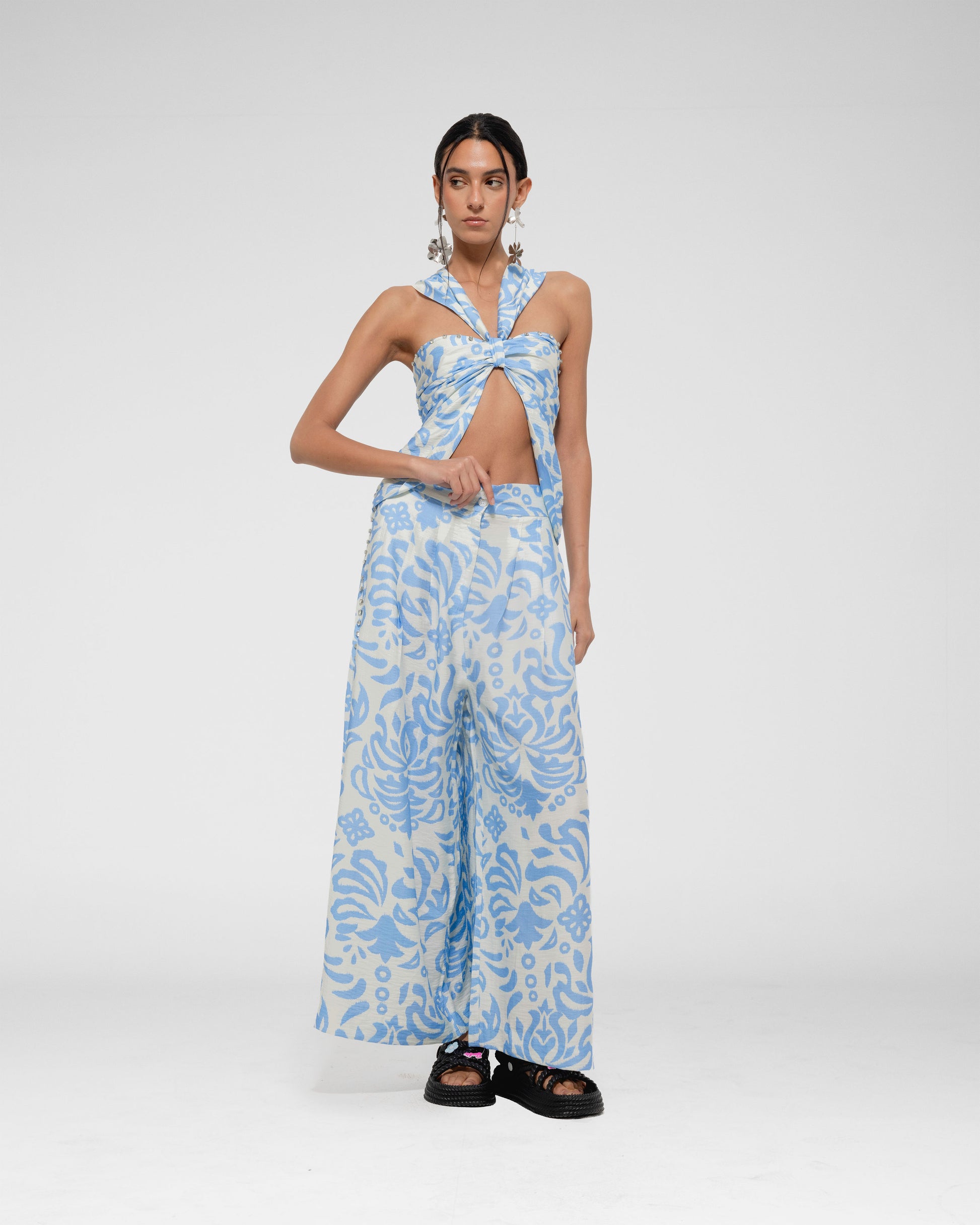 Blue-and-white patterned halter top with a knotted front and open midriff.