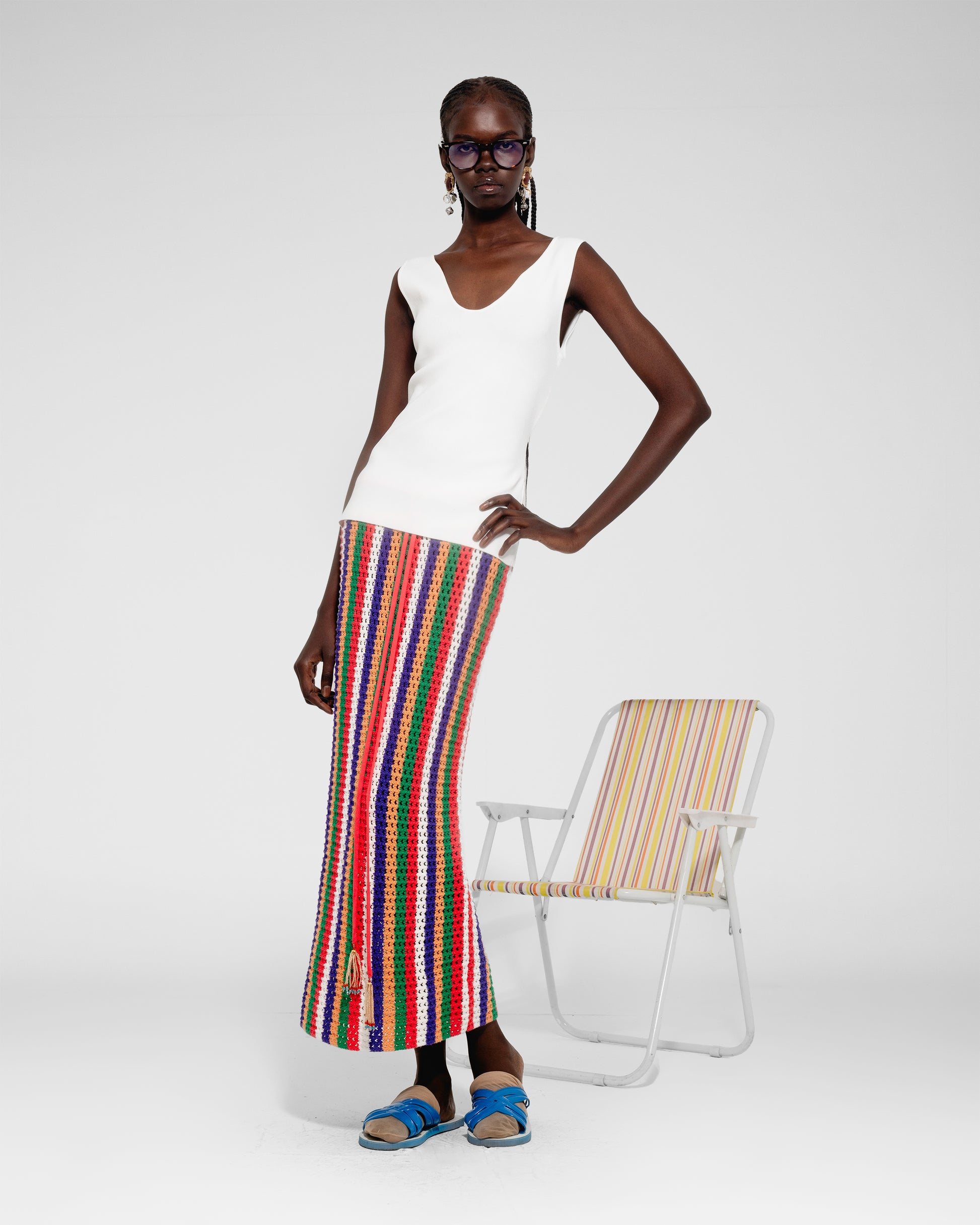 Sleeveless tank with a deep scoop neckline and an open, banded back design.