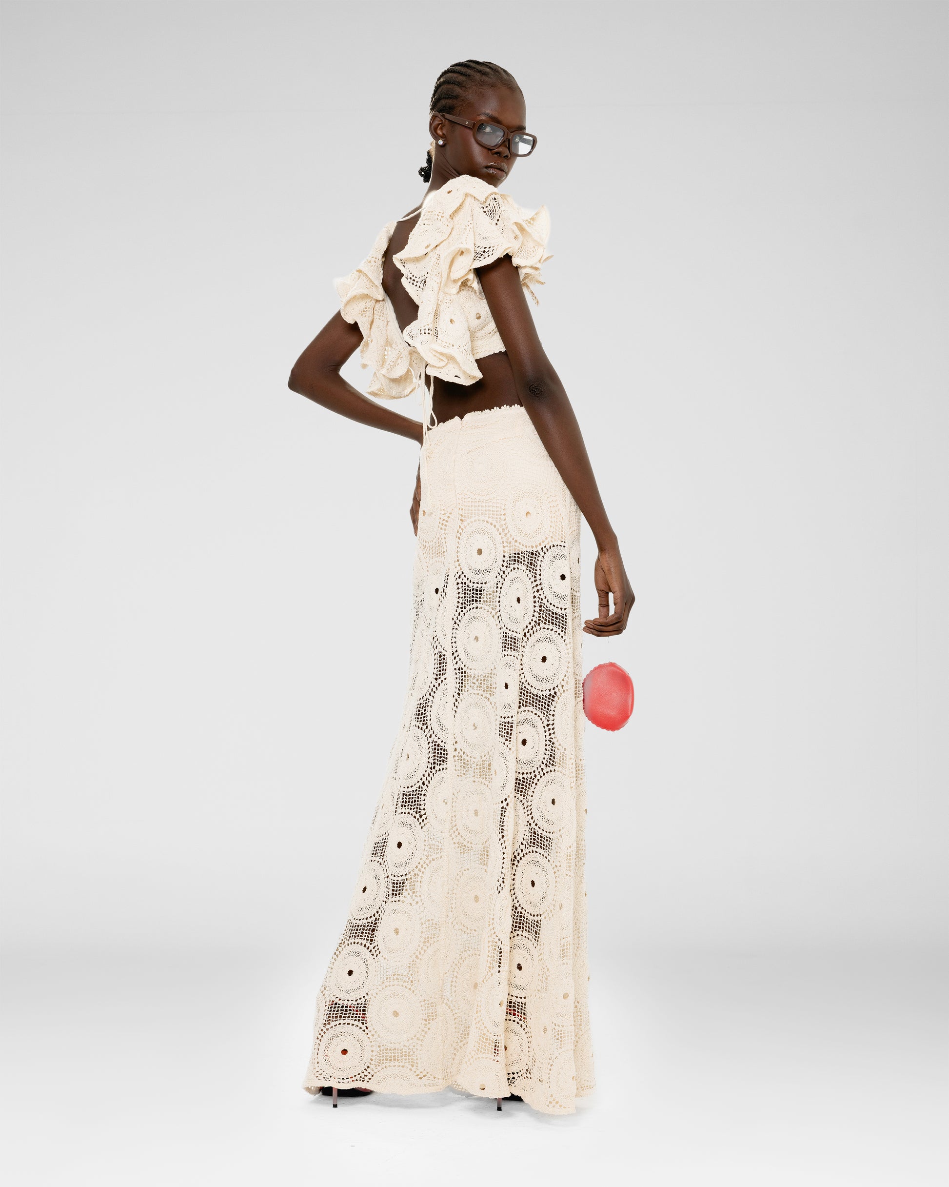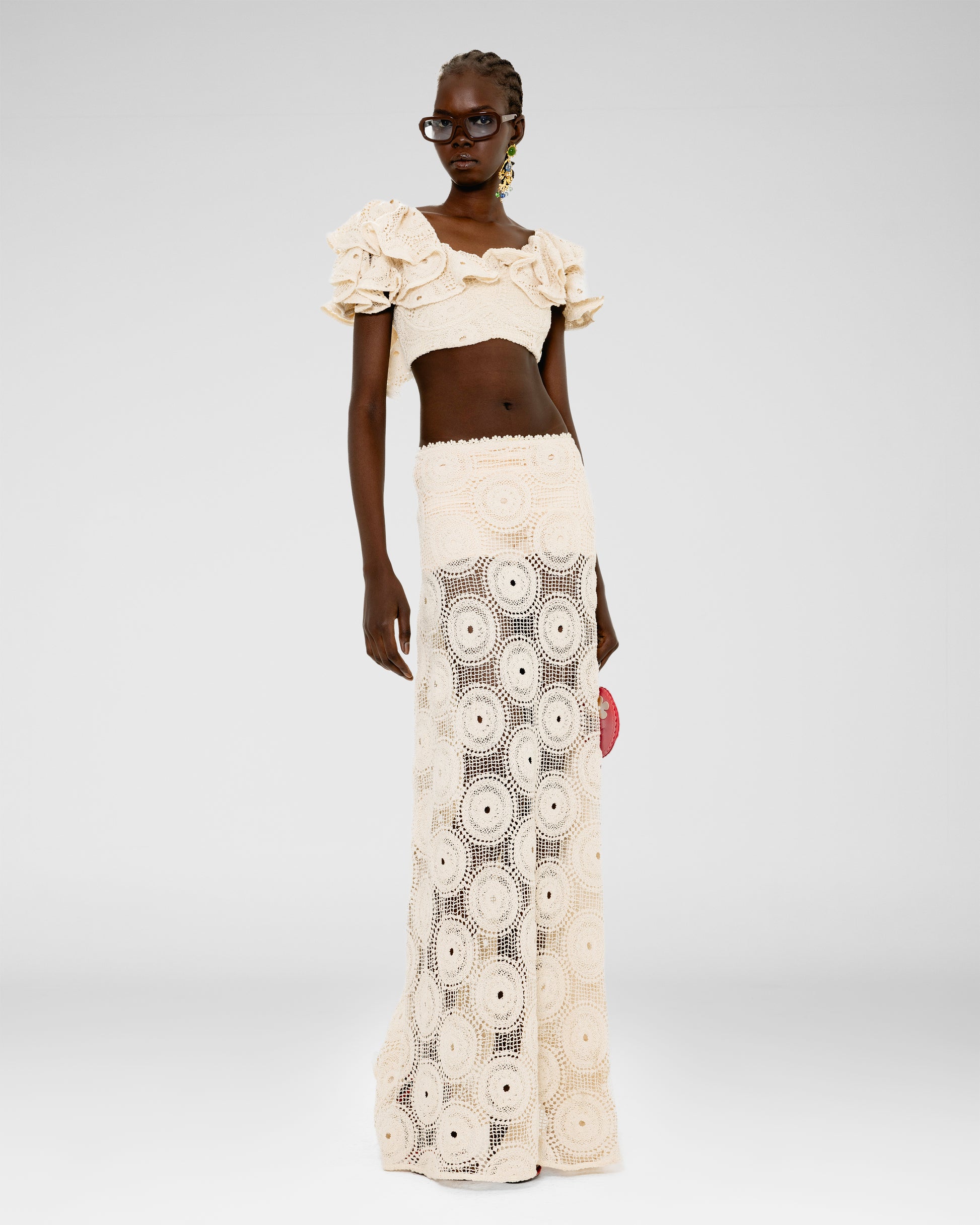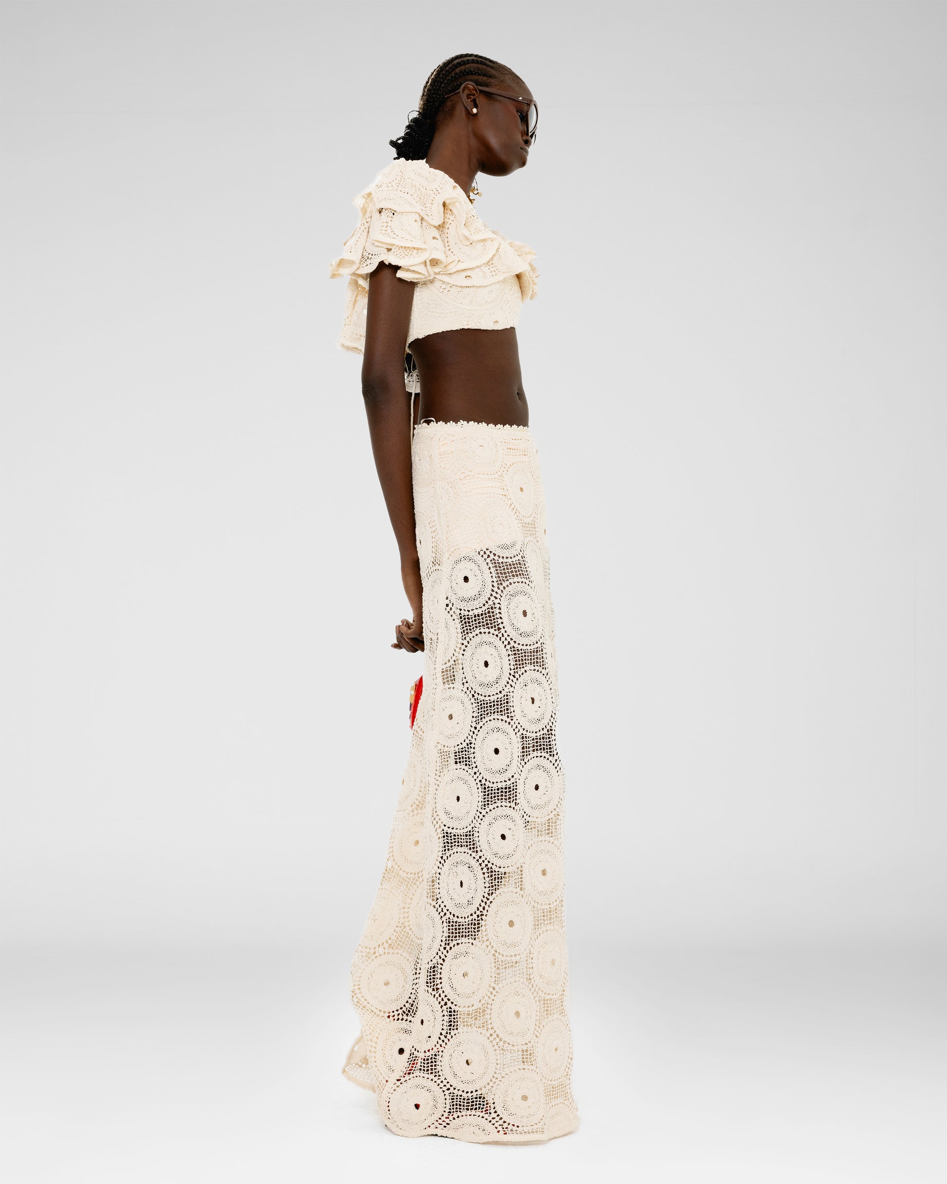Cream crochet crop top with voluminous ruffled sleeves and intricate openwork details.