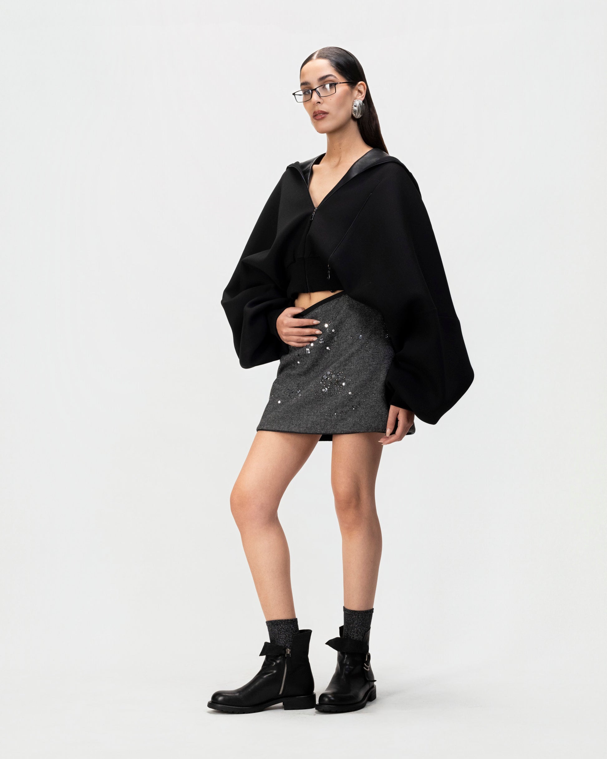 Designed for evening wear or elevated styling, this skirt pairs effortlessly with fitted tops, knits, or layered outerwear. Bold yet refined, it brings texture, rhythm, and confidence to any look.