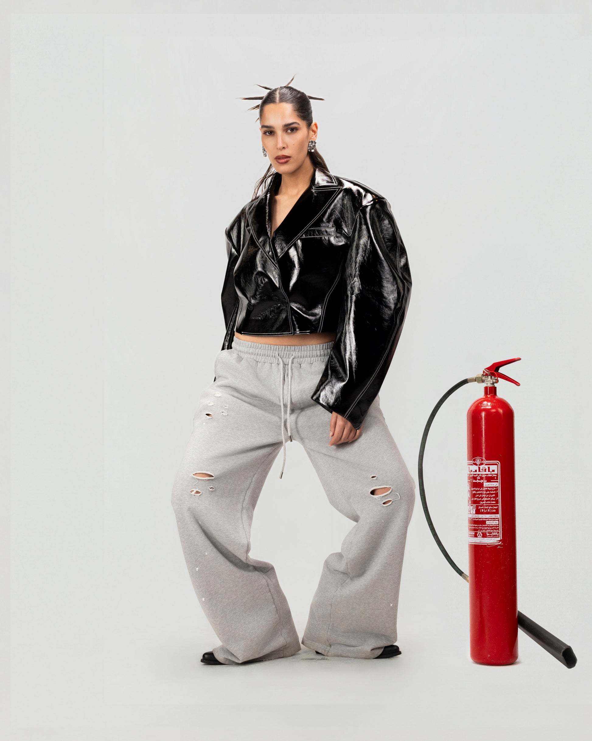 The Black Chrome Cropped Jacket is a bold statement layer defined by its high-gloss finish and sharp, cropped silhouette. Crafted from a coated fabric with a mirror-like sheen, it features exaggerated volume through the sleeves and shoulders, balanced by a clean, structured body. Classic lapels and a button-front closure ground the design, while the cropped length gives it a modern, directional edge.Designed to catch the light and command attention, this jacket brings attitude to both casual and elevated looks ,powerful, polished, and unapologetically modern.