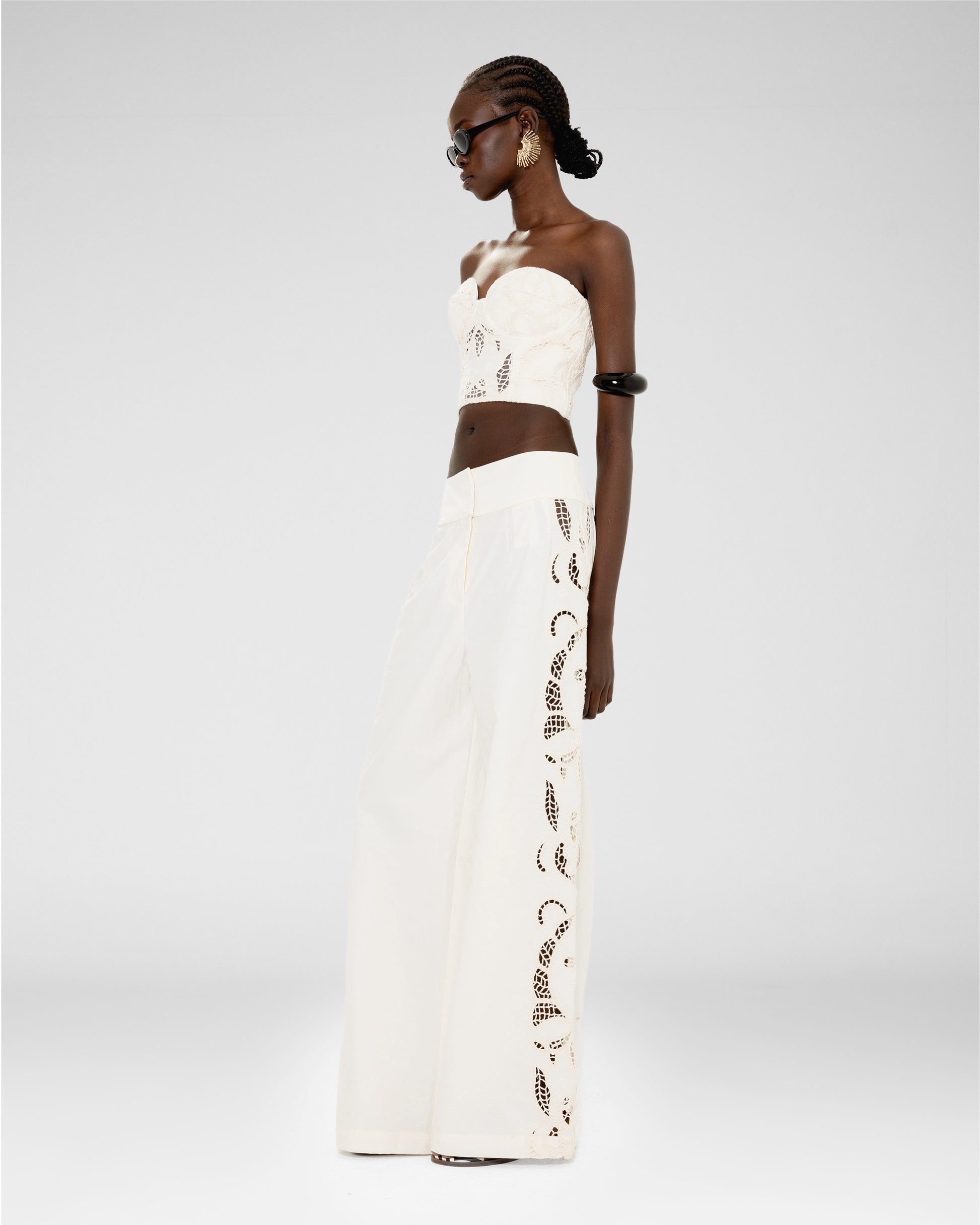 High-waisted black trousers featuring bold floral cutwork panels along the sides.