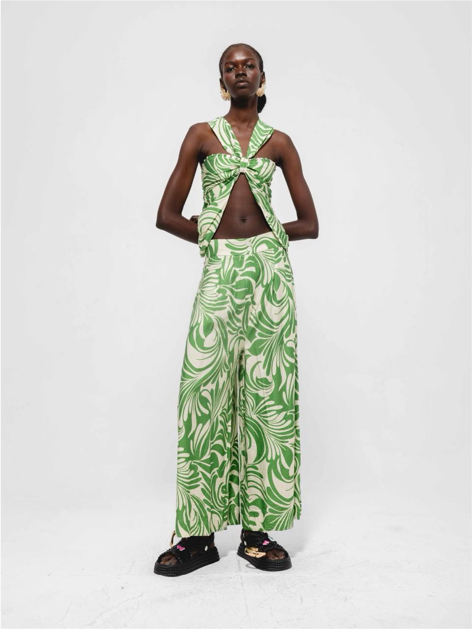 Fresh two-piece set featuring high-waist wide-leg trousers in a blue-and-white botanical motif with relaxed pockets, paired with a matching halter top with a knotted front and open midriff