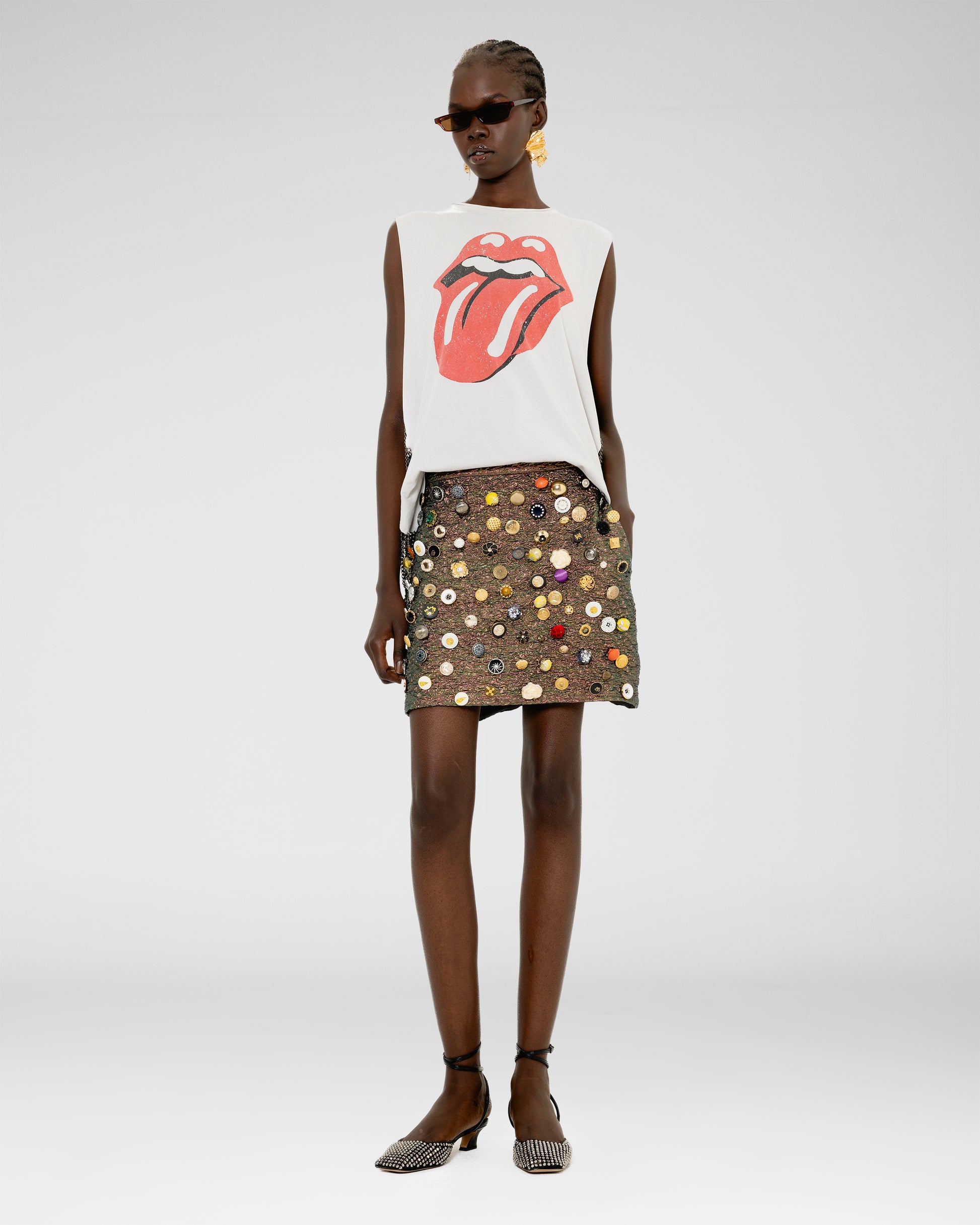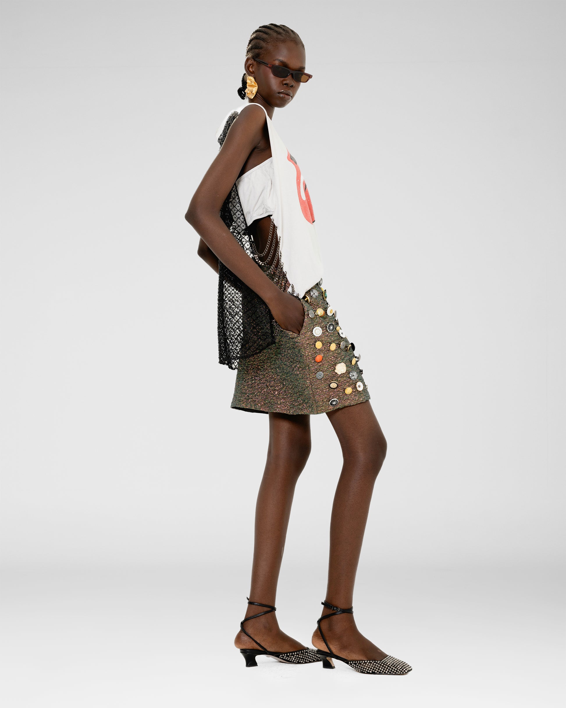 A high-shine mini skirt adorned with multicolored button-like embellishments, creating a playful clash of texture and sparkle. Its straight cut and statement details bring a bold, artful energy to any look.