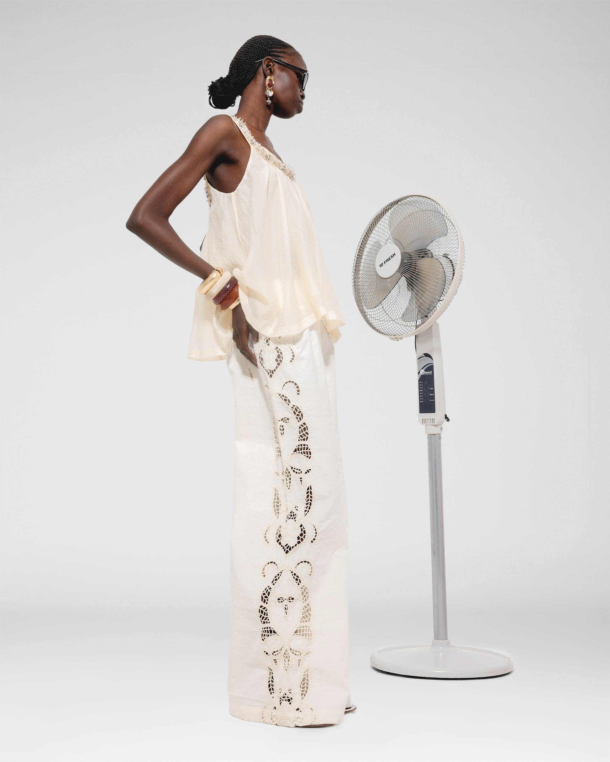 Loose ivory top with beaded neckline and flowy silhouette.