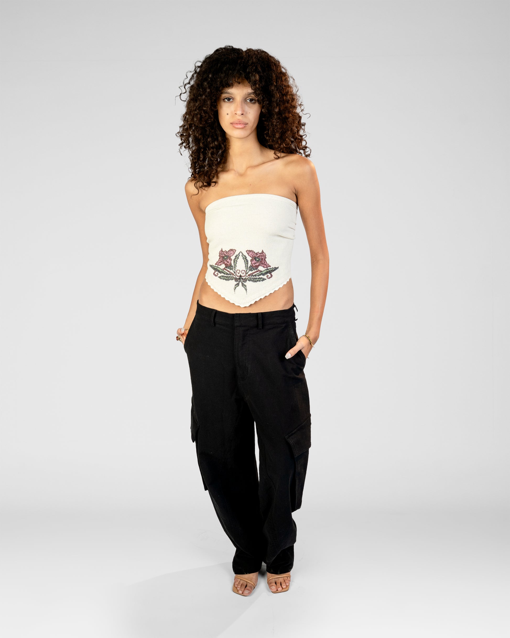 Strapless black bandeau with scalloped hem and a jeweled floral embroidery at the front.