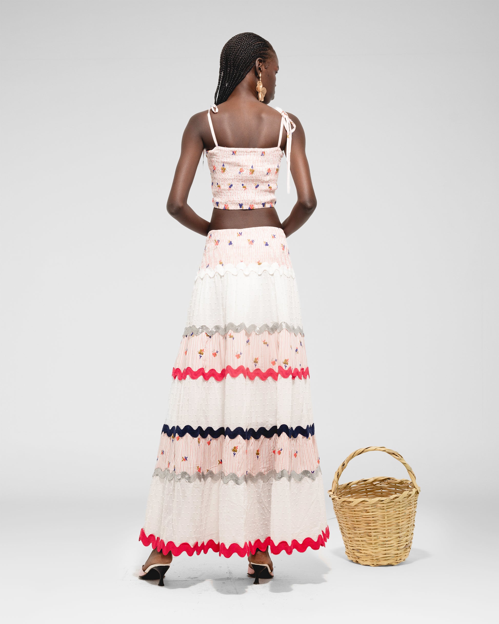 lowing maxi skirt with embroidered stripes, wavy trims, and playful pops of color.
