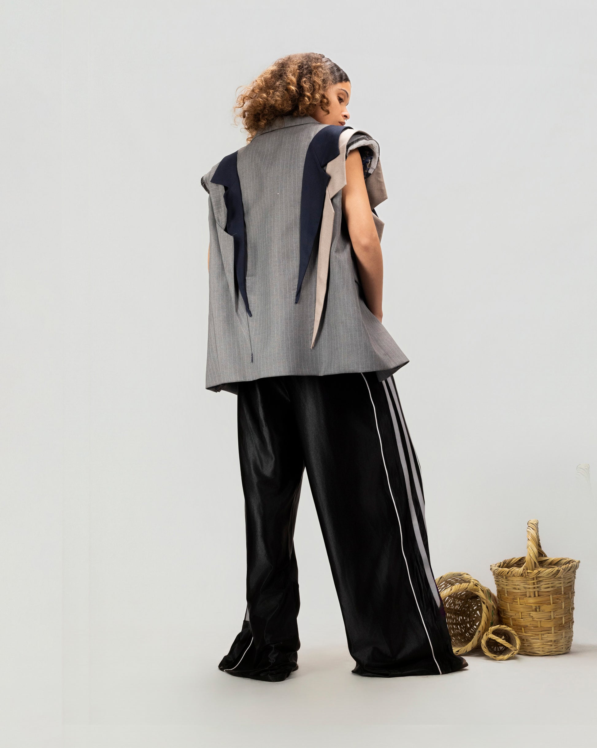 A deconstructed tailored vest built from layered suiting panels for a sharp yet fluid silhouette. Featuring contrasting fabrics and raw-edged construction, this piece blends classic tailoring with an experimental, directional feel. Designed to be worn open over tees or knits, it adds structure without rigidity.