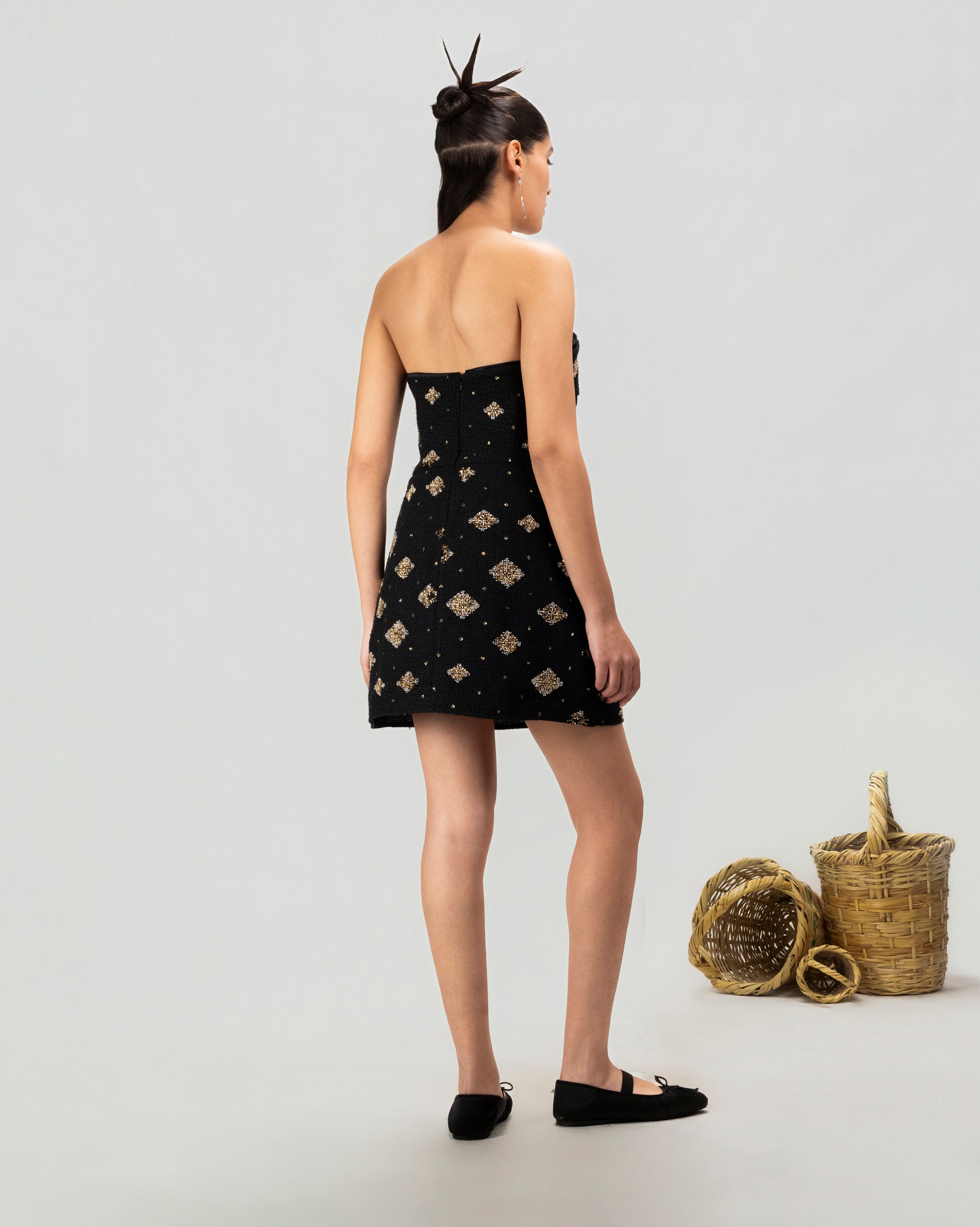 The Gilded Night Mini Dress is a strapless statement piece defined by its rich texture and subtle shimmer. Crafted from a black woven base with metallic embroidered motifs throughout, it features a clean, body-skimming silhouette that highlights the shoulders and neckline. The structured bodice offers a secure fit, while the mini length keeps the look modern and balanced.Designed for evenings or elevated occasions, this dress pairs effortlessly with minimal accessories or layered outerwear for contrast—bold yet refined, with a timeless edge.