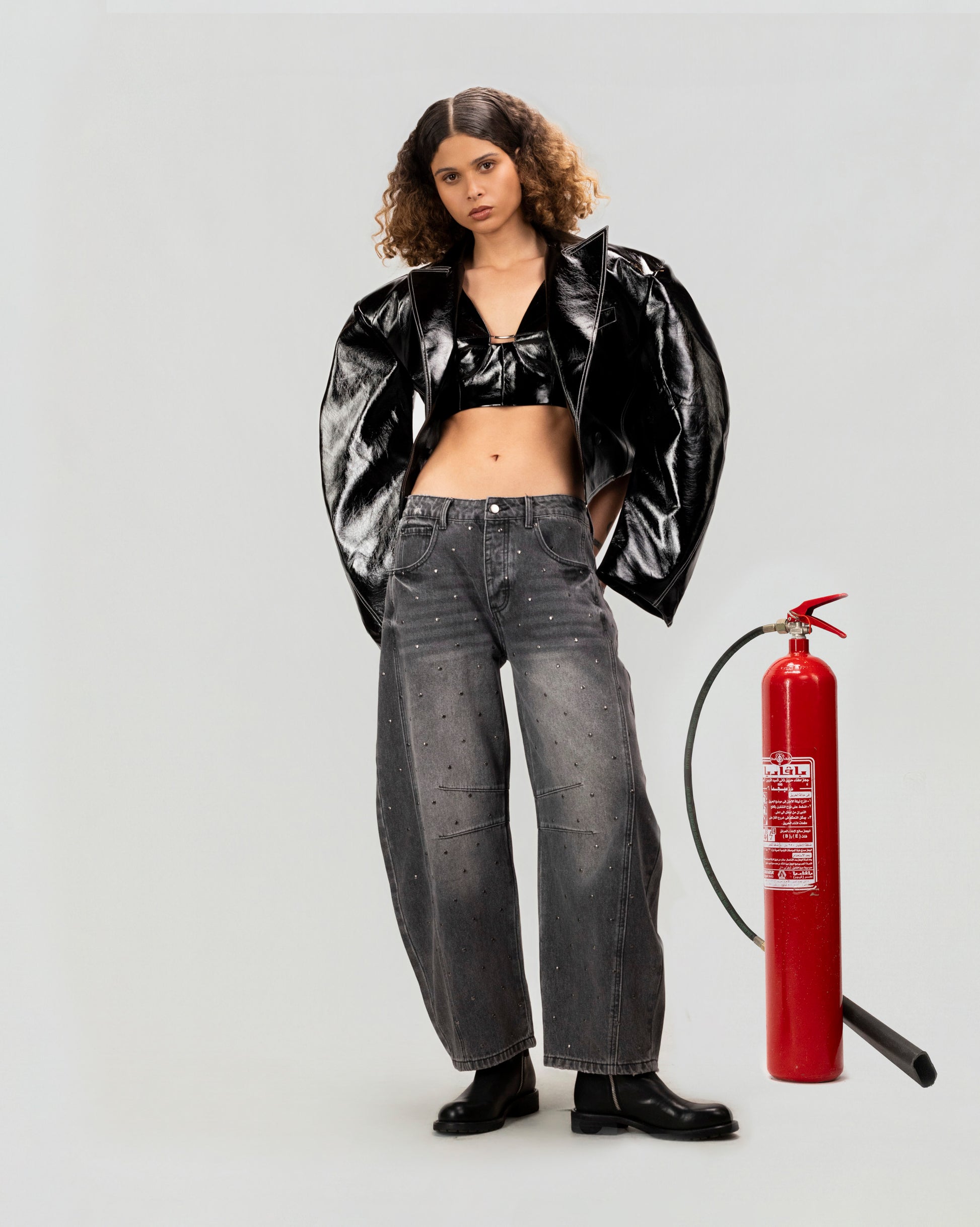 A sleek cropped bralette crafted in high-shine patent fabric with a sculpted, structured fit. Designed with a deep V neckline and subtle seaming for shape, it delivers a bold, modern edge while staying minimal and versatile. Perfect layered under tailoring or worn solo for a statement look.