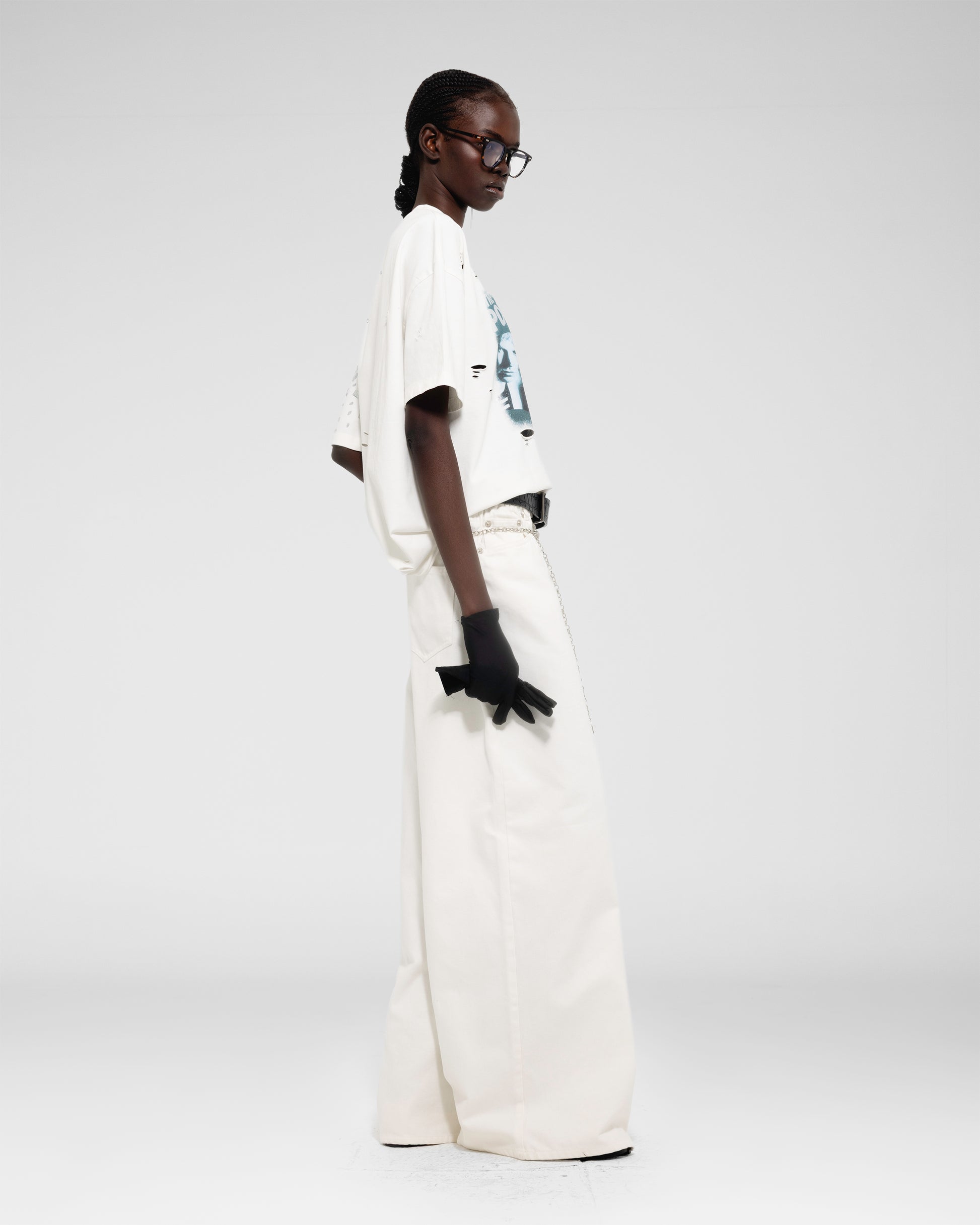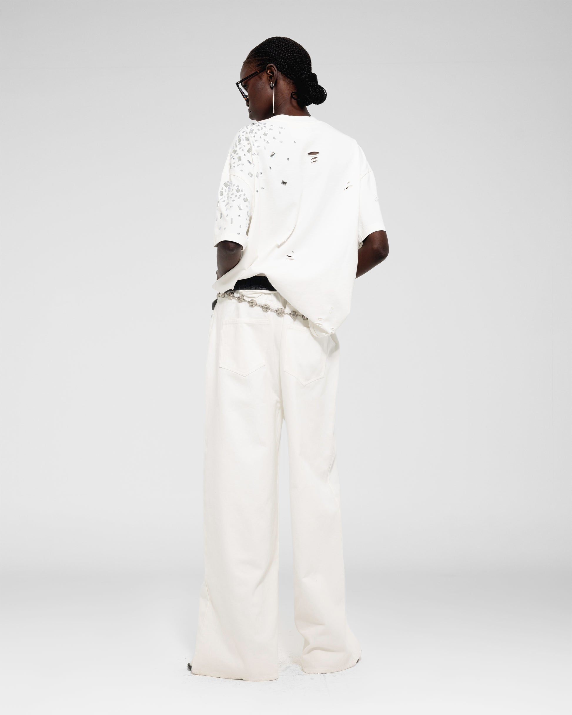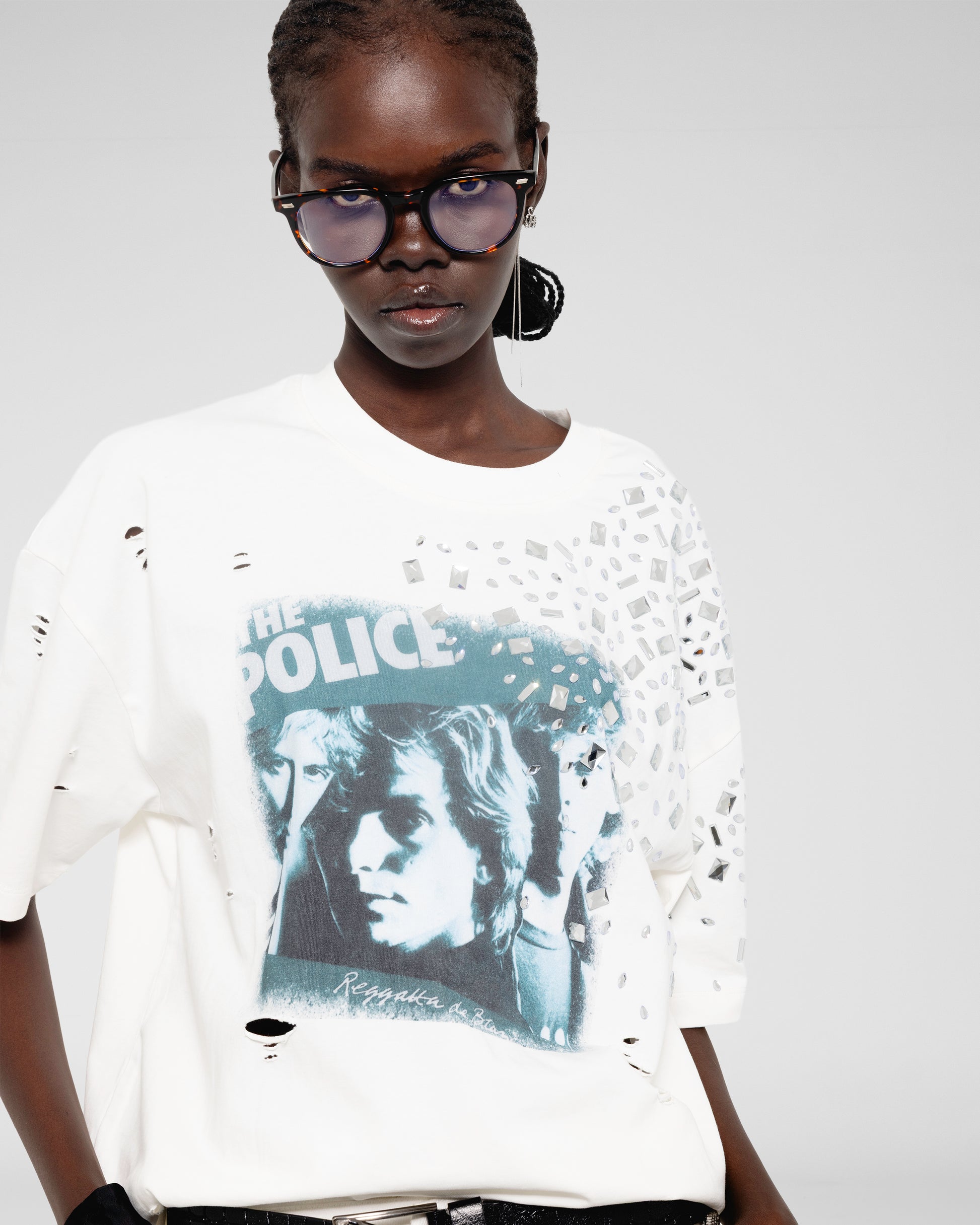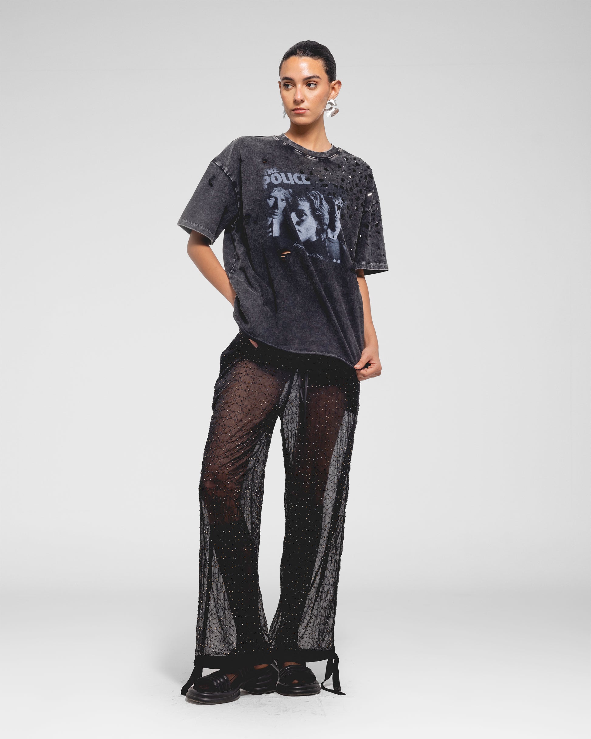 Oversized faded band tee with mirrored bead embellishments scattered across the shoulder.