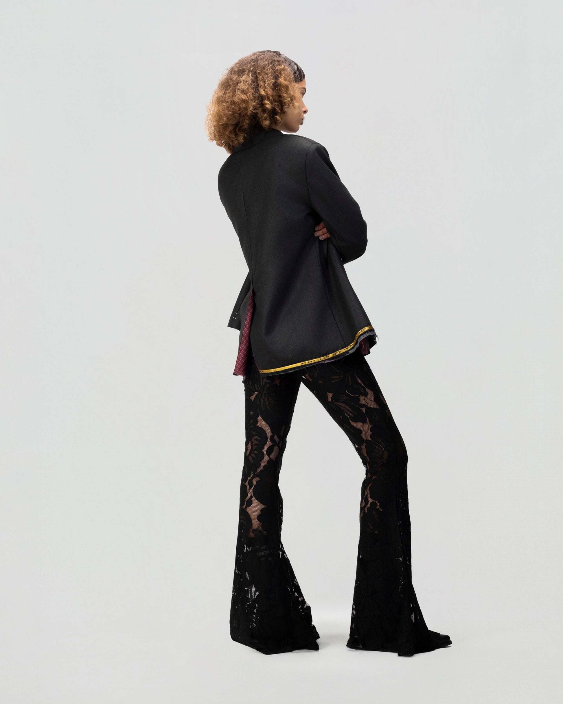 The Noir Lace Flare Pant is a refined statement piece defined by its sheer floral lace texture and softly flared leg. Cut with a slim fit through the thigh that opens gradually at the hem, it creates an elongated, fluid silhouette. The lightweight lace adds depth and movement, balancing elegance with a subtle edge.Designed to be styled with minimal layers or contrasting textures, these pants bring a modern, fashion-forward feel to evening or elevated day looks.