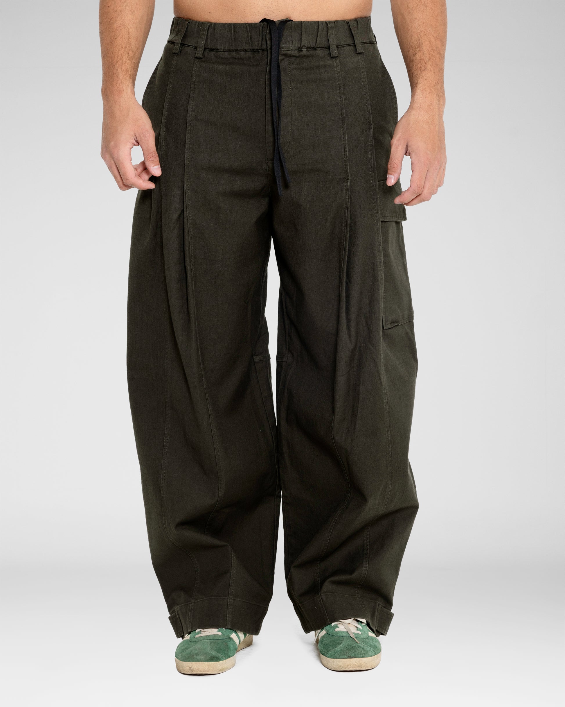 Deep olive wide-leg cargos with functional detailing and urban ease.