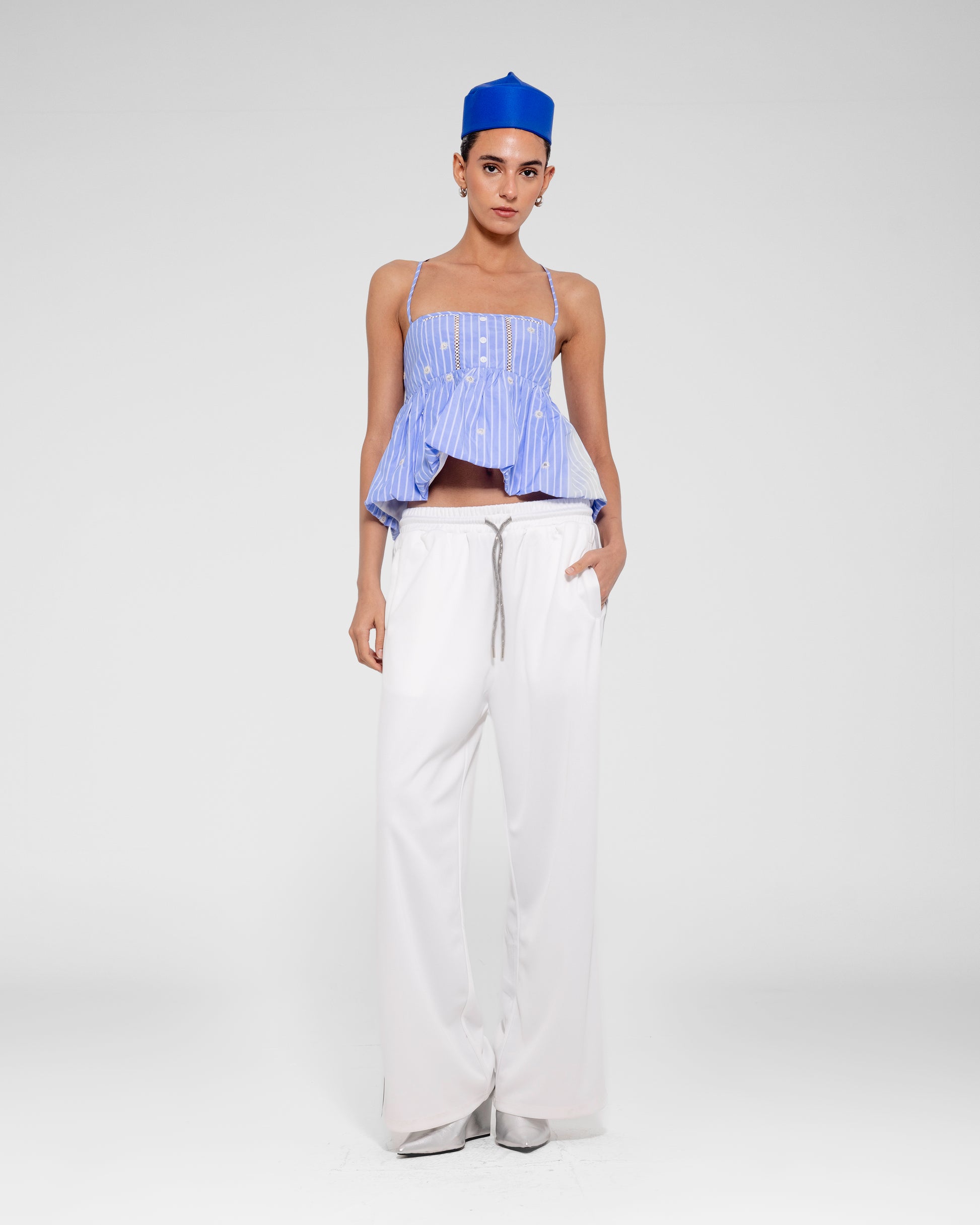 Striped, button-front peplum cami with delicate lace inserts, thin straps, and a flared hemline.