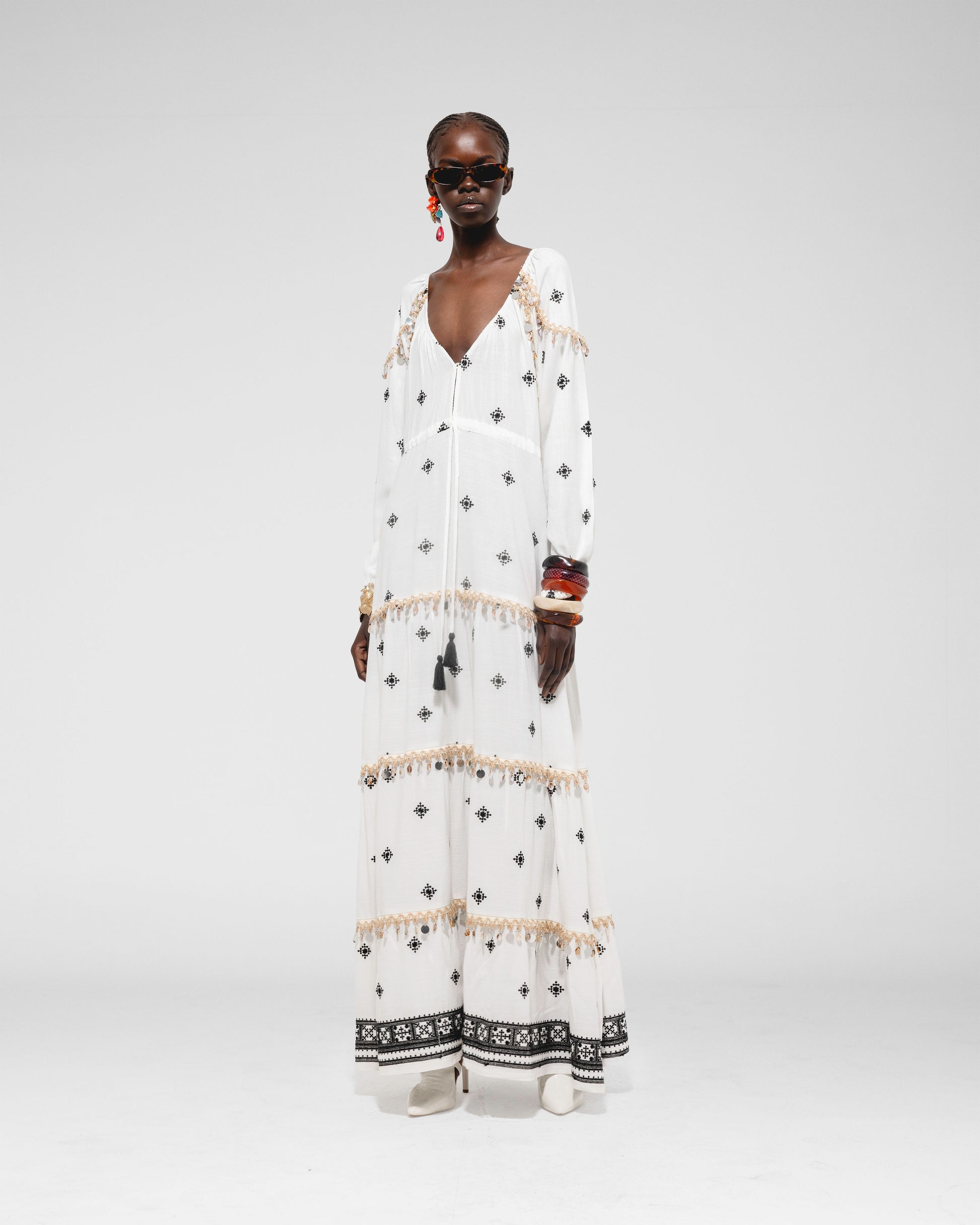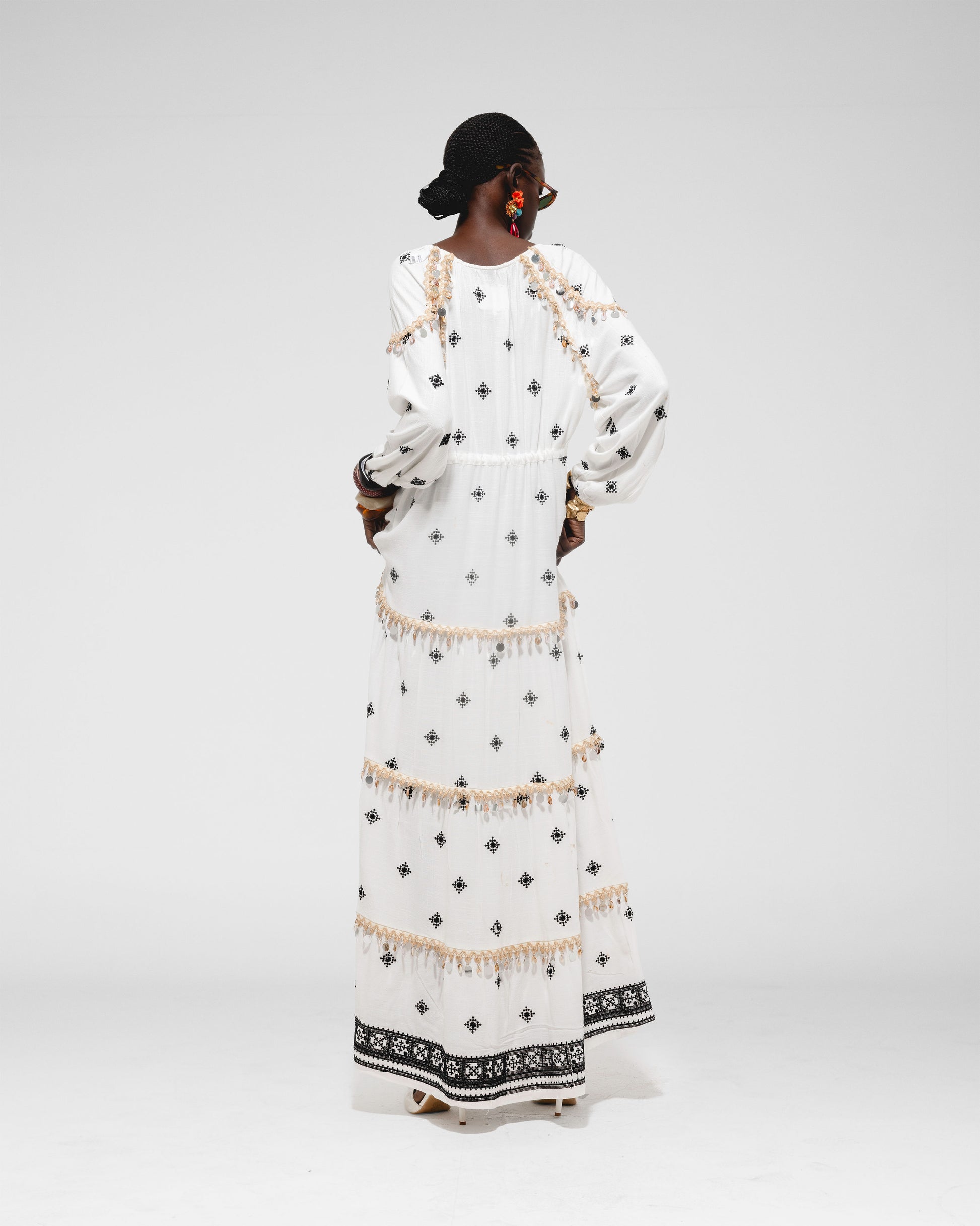 Flowy white maxi with black motifs, tassel accents, and tiered pompom trim.