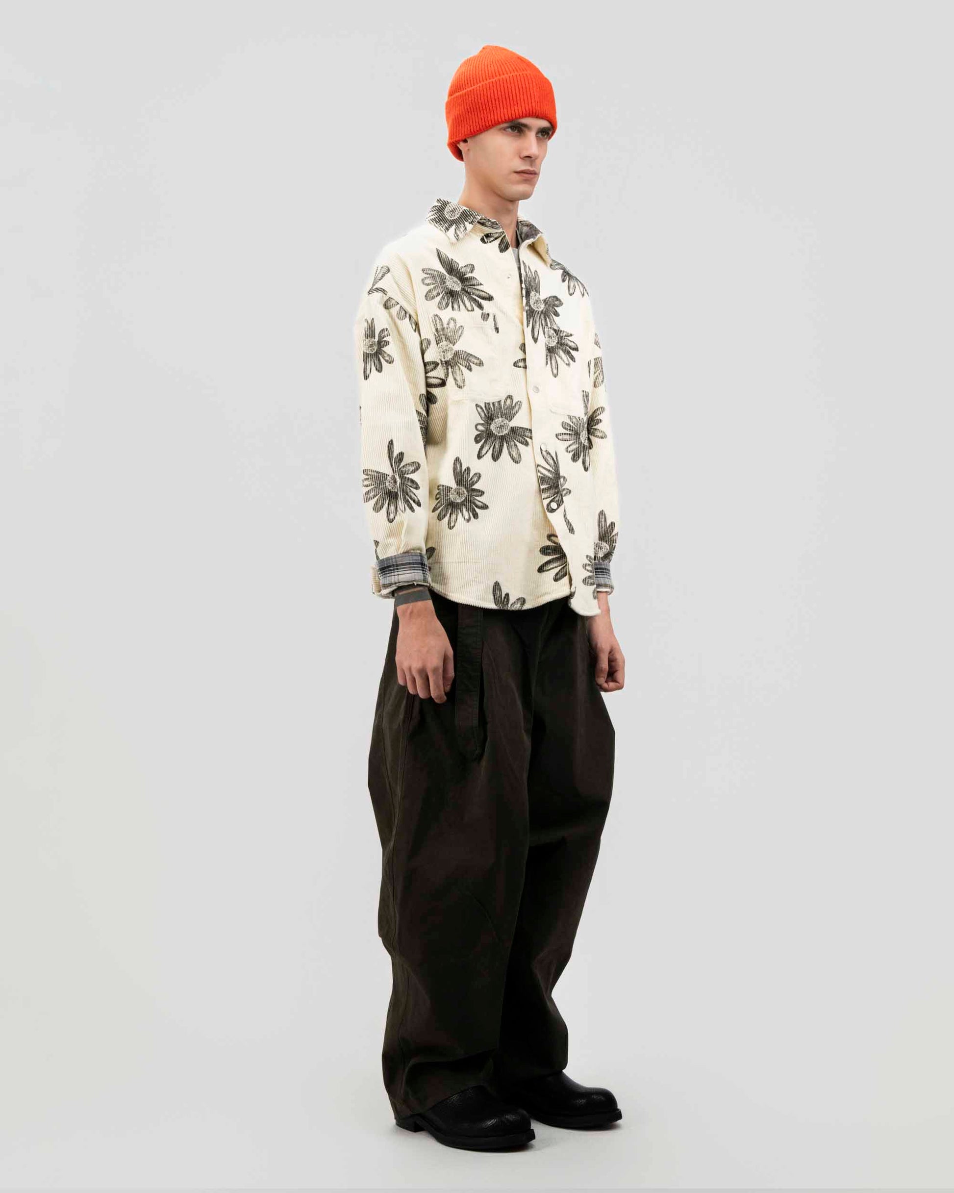 A relaxed corduroy shirt finished with an all-over floral print that adds warmth and character. Cut with an easy, boxy fit, it features a soft textured hand, button-front closure, and subtle structure that works layered or on its own. Equal parts playful and grounded, this piece brings a quiet statement to everyday dressing.