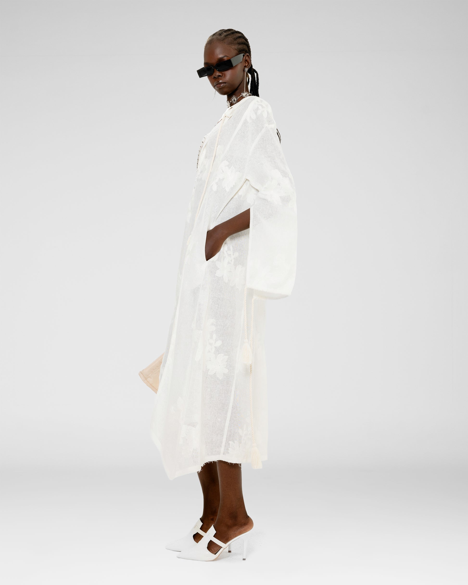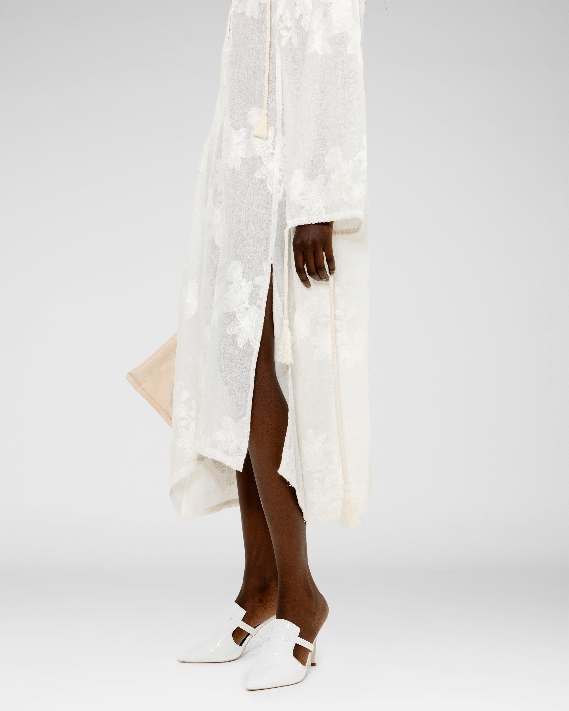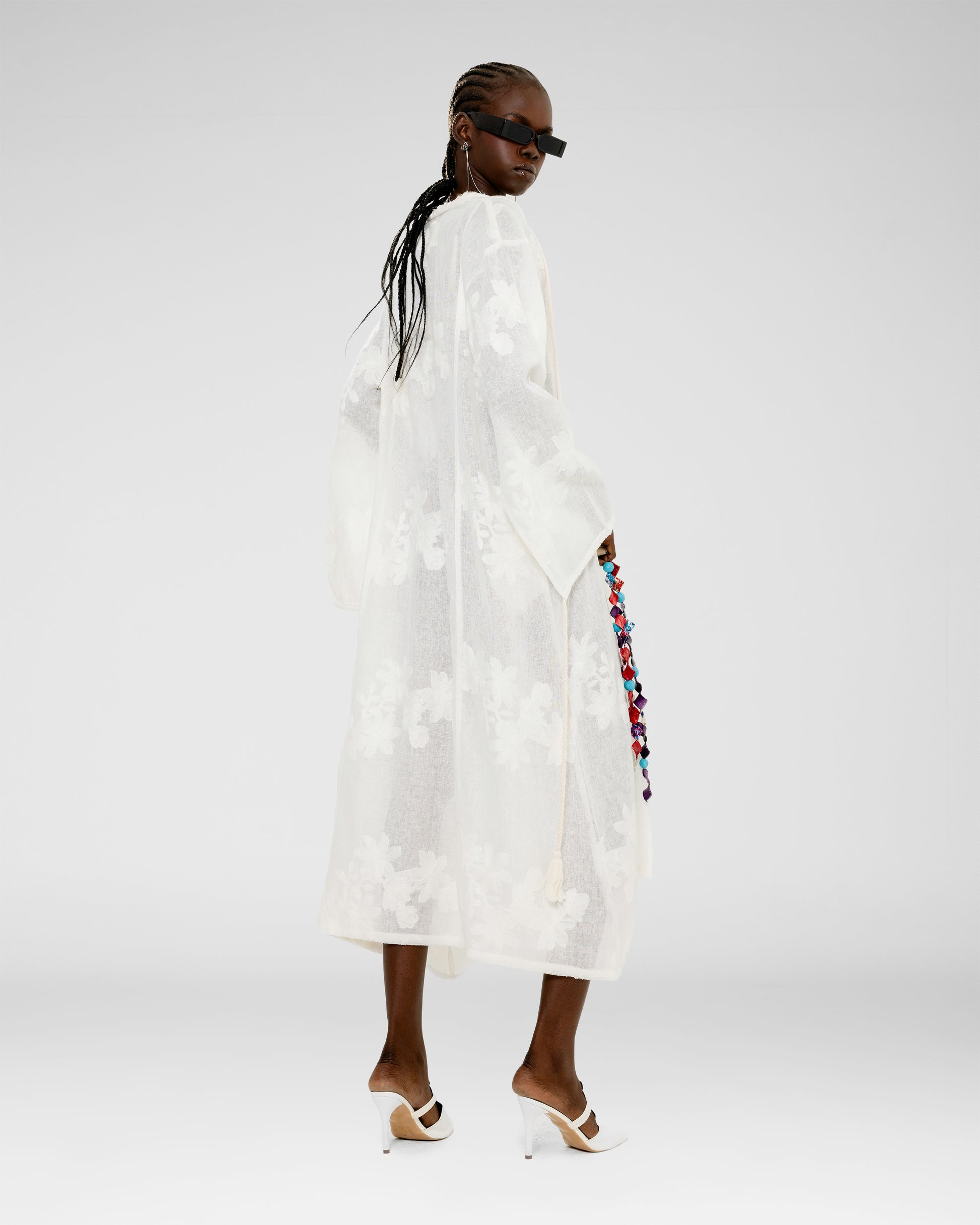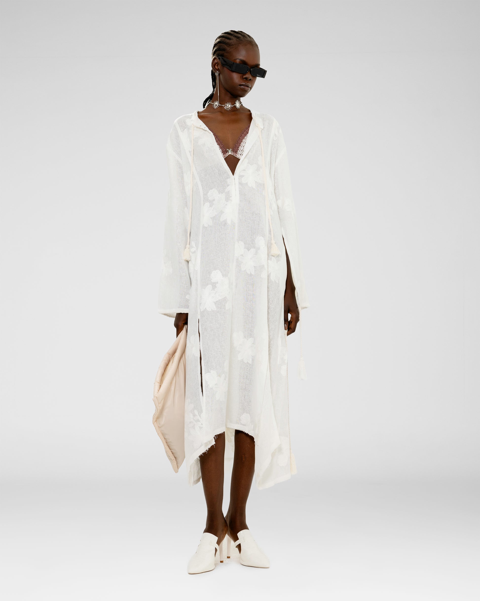 Semi-sheer floral maxi with side slits and hidden pockets.