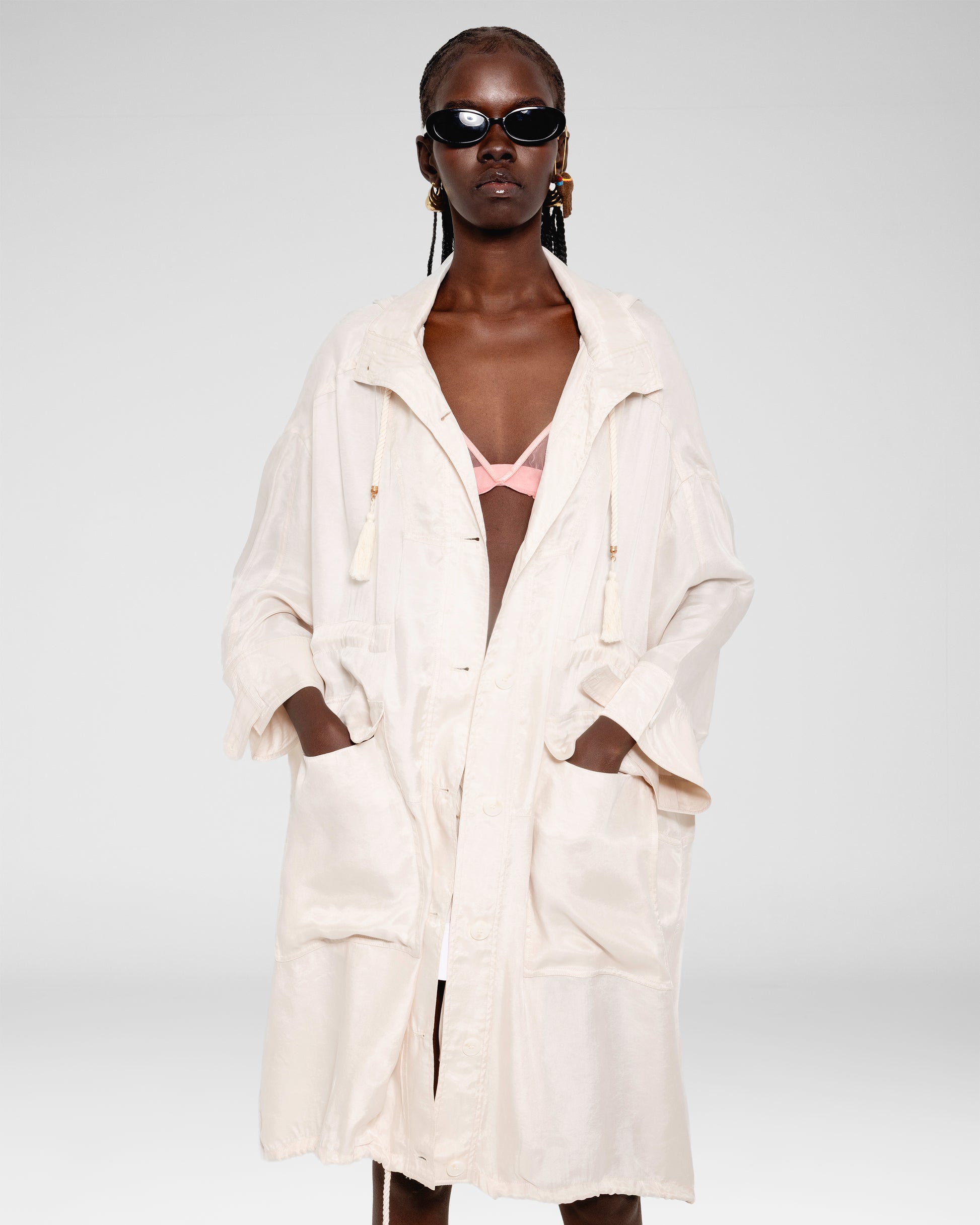 Effortlessly chic and supremely comfortable, this oversized ivory coat is the perfect layering piece for transitional seasons. Crafted from a lightweight, breathable fabric, it features a relaxed fit, a hood with drawstring details, and large patch pockets for a blend of utilitarian style and casual elegance. Ideal for adding a sophisticated yet laid-back touch to any outfit