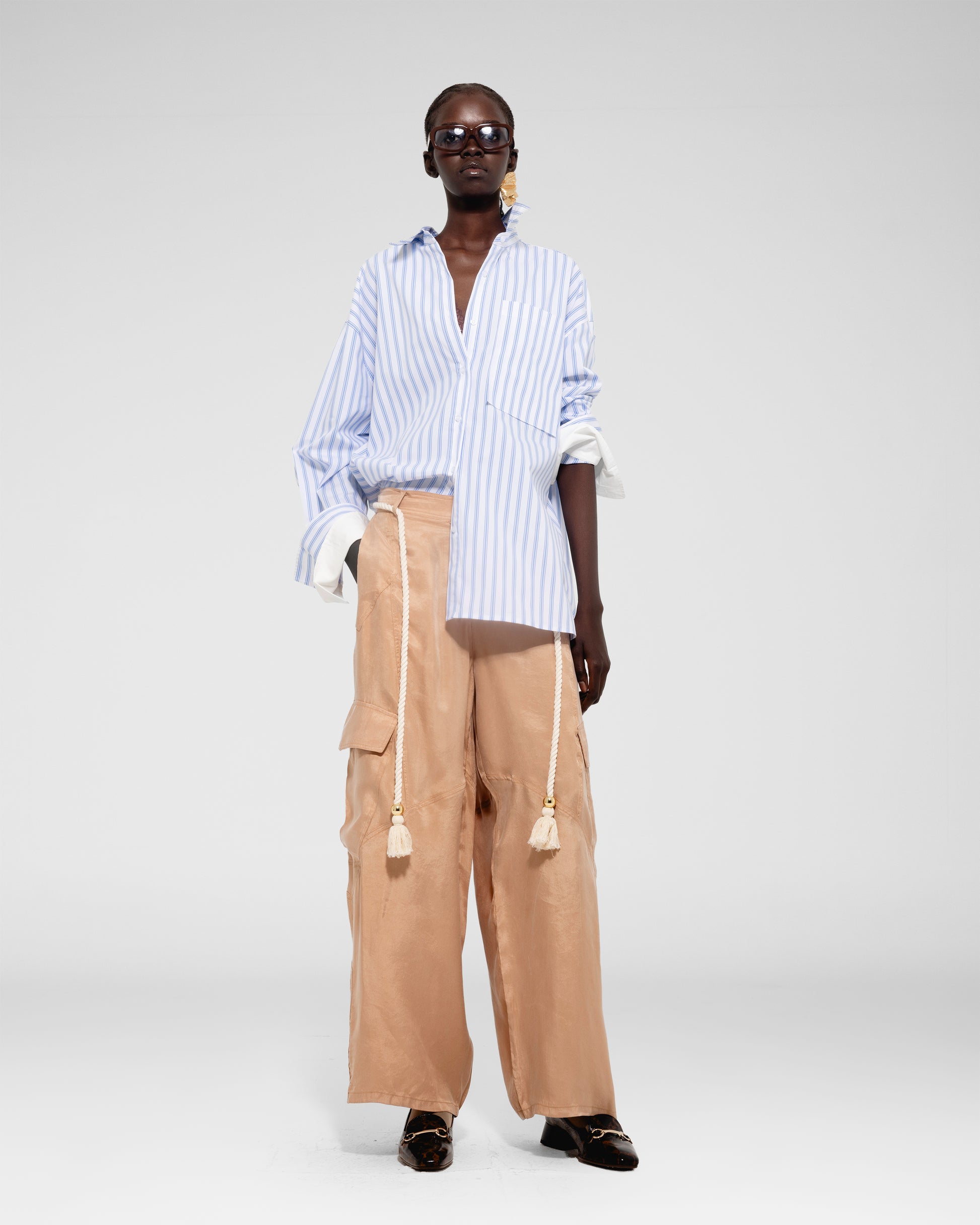 Light blue and white vertical stripe button-up with a relaxed fit and dropped shoulders.