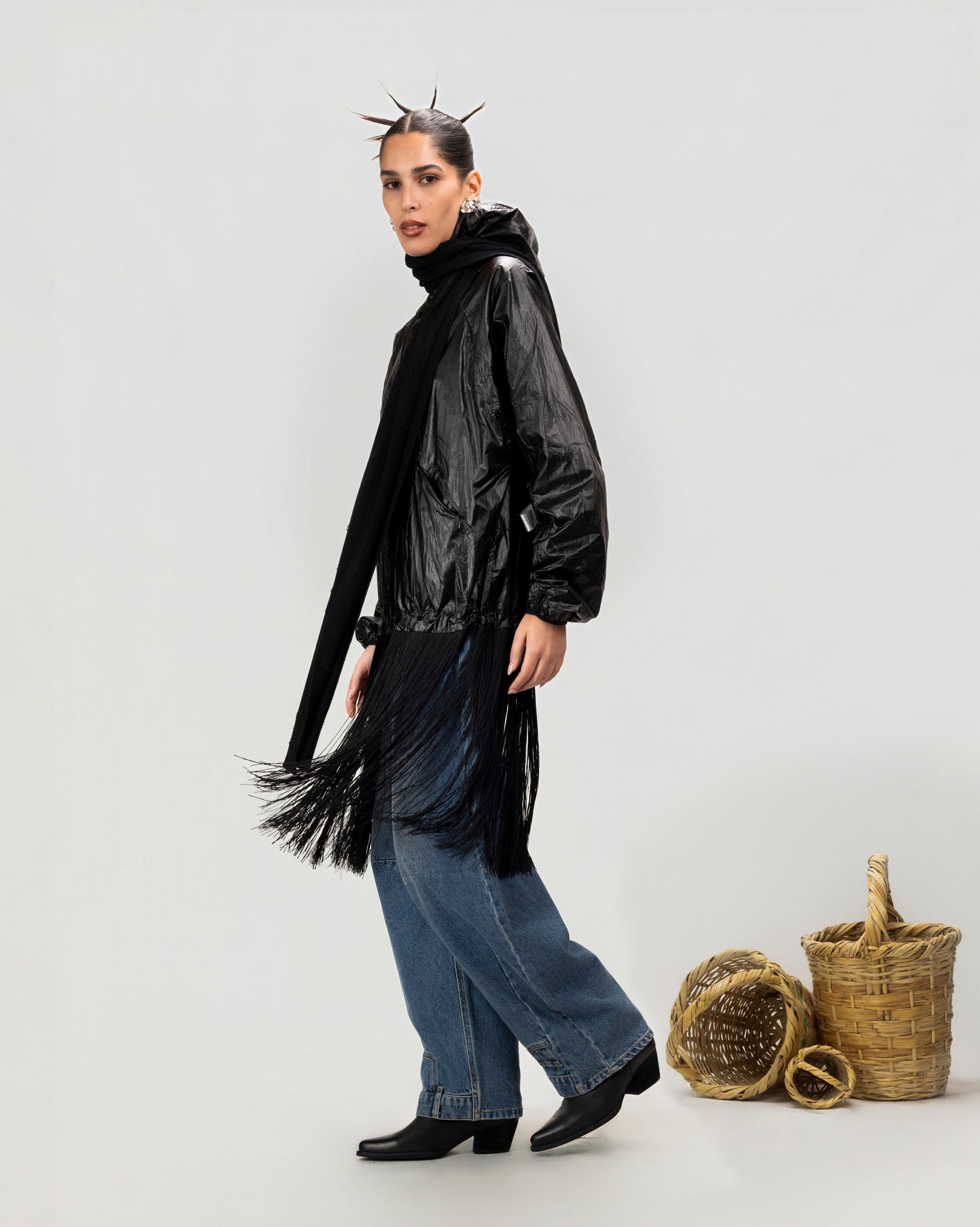 The Veil Fringe Scarf is a lightweight knit scarf designed to add texture, movement, and subtle drama to layered looks. Crafted with an openwork knit structure, it features delicate perforations throughout and a long fringed edge that moves fluidly with the body. The elongated silhouette allows for versatile styling—draped loosely, wrapped around the neck, or layered over outerwear.